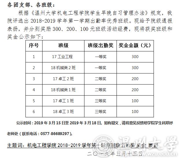 关于91色情 2018-2019第一学期出勤奖励的公示