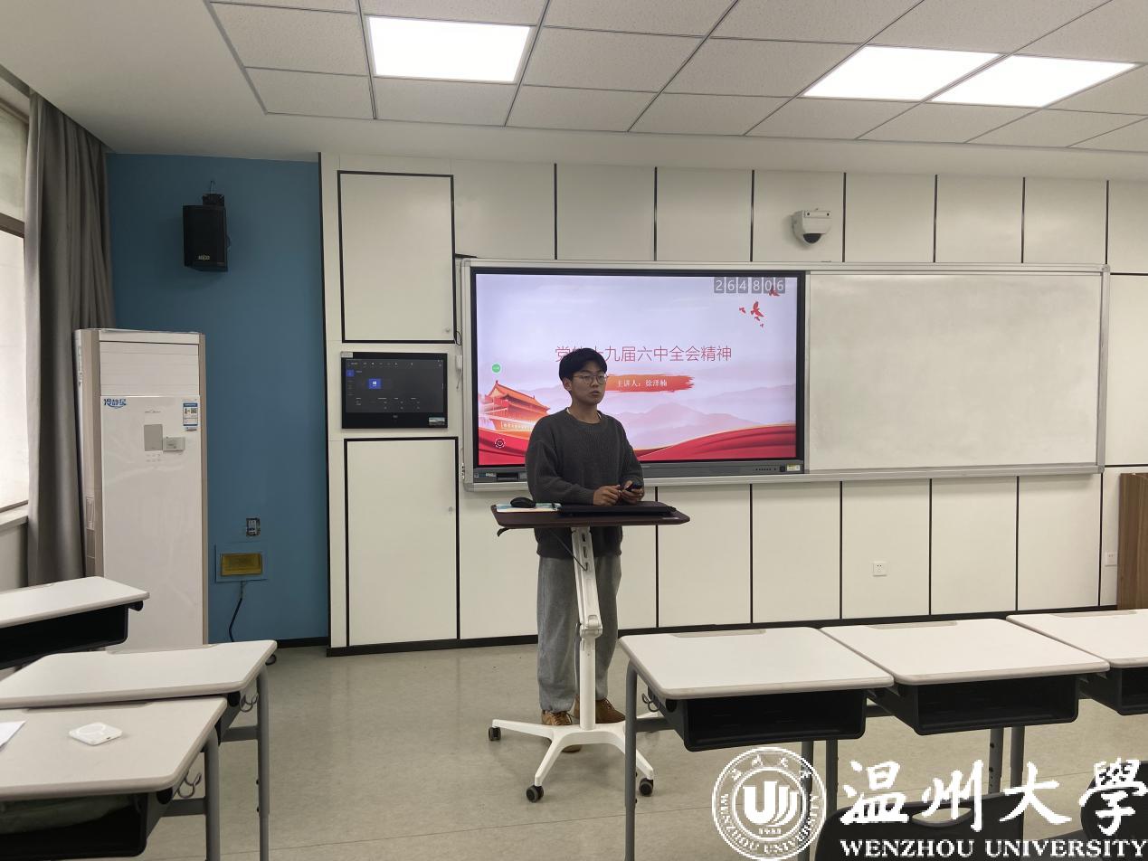 首先由徐泽楠同志带大家一起学习党的十九届六中全会精神。徐泽楠同志从党的十九届六中全会的历史、内容以及学生党员如何学习党的十九届六中全会三个方面展开,向我们展示了“一个根本、两个确立、三次飞跃、四个时期”,并号召我们广大党员同志学习新思想,拓展“广度”、彰显“温度”、加大“力度”,提高责任意识,争做时代新青年。