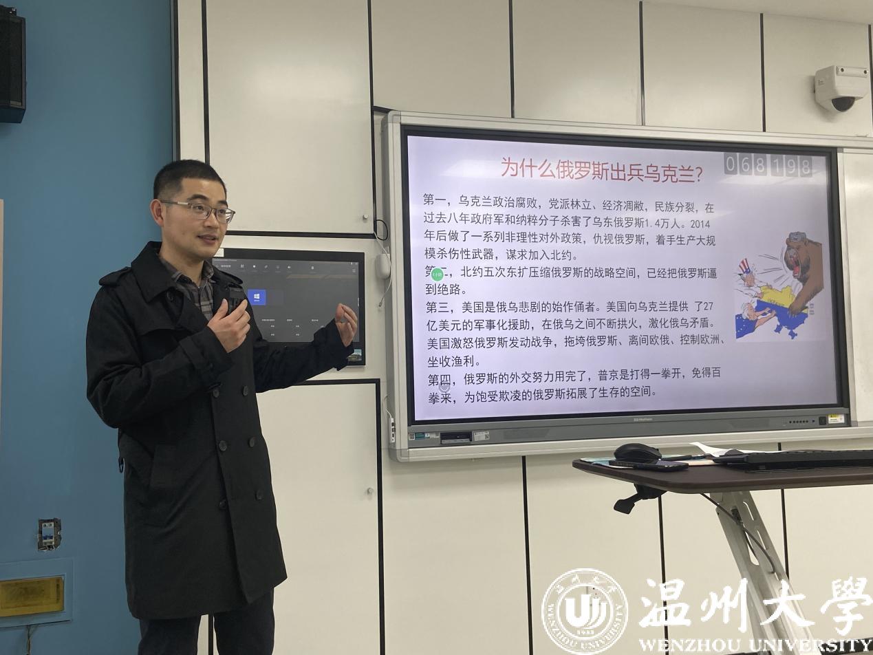 紧接着是由徐欢老师为大家讲解如何正确看待俄乌冲突。他从俄罗斯与乌克兰之间的历史发展以及国际社会对此次冲突的不同看法及俄乌冲突带来的启示等方面展开,要求我们学生党员应当树立正确的历史观、大局观以及角色观。面对此类事件,作为大学生以及一名党员,应当理性对待,坚持独立自主的和平外交政策,珍惜和平,同时在网络上也应当要正确行使发言权。