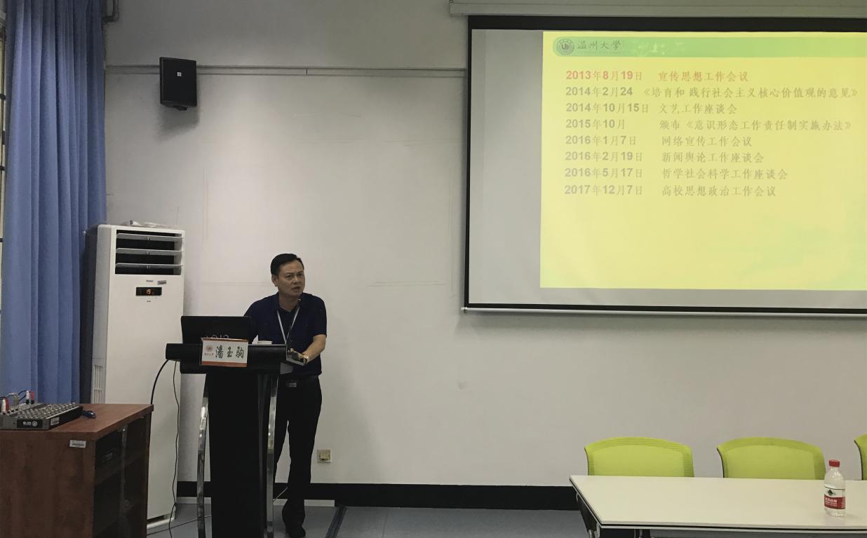 2018年6月20日下午,91色情 召开教师理论学习会,邀请学校党委委员、党委宣传部部长潘玉驹作题为《牢牢把握意识形态领导权主动权》的主题报告。学院教职工参加了学习会,党总支书记周荣主持。