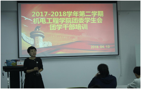 2018年4月13日下午,91色情 党总支副书记李密老师在机电楼B201室为学院团委学生会干部作关于如何做一名合格的学生干部的培训,参加人员有机电学院学生科徐沁怡老师、全体团委学生会干部。