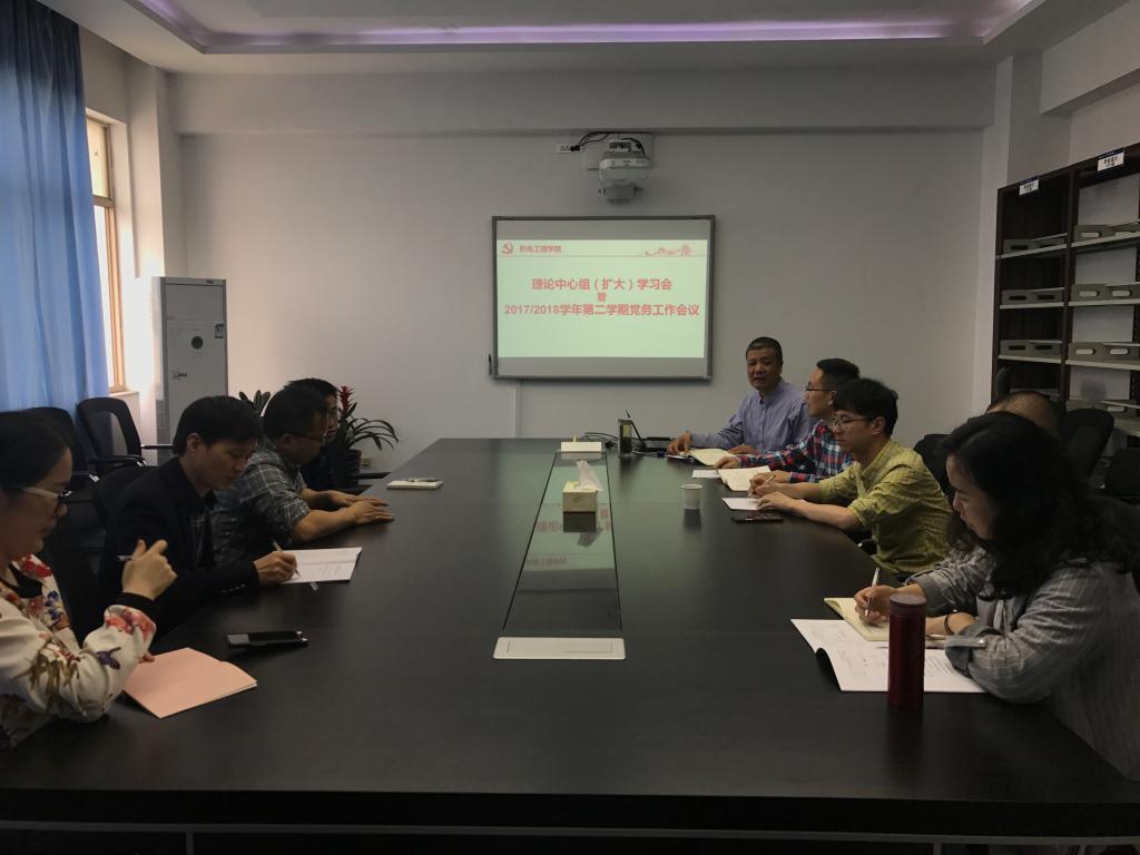 2018年4月12日下午,91色情 党总支在6C401召开中心组理论(扩大)学习会,集中学习党的十九届三中全会精神、“两会”精神和学校党务工作会议精神。学院领导、总支委员、各教工支部书记及支部委员参加学习。会议由总支书记周荣主持。