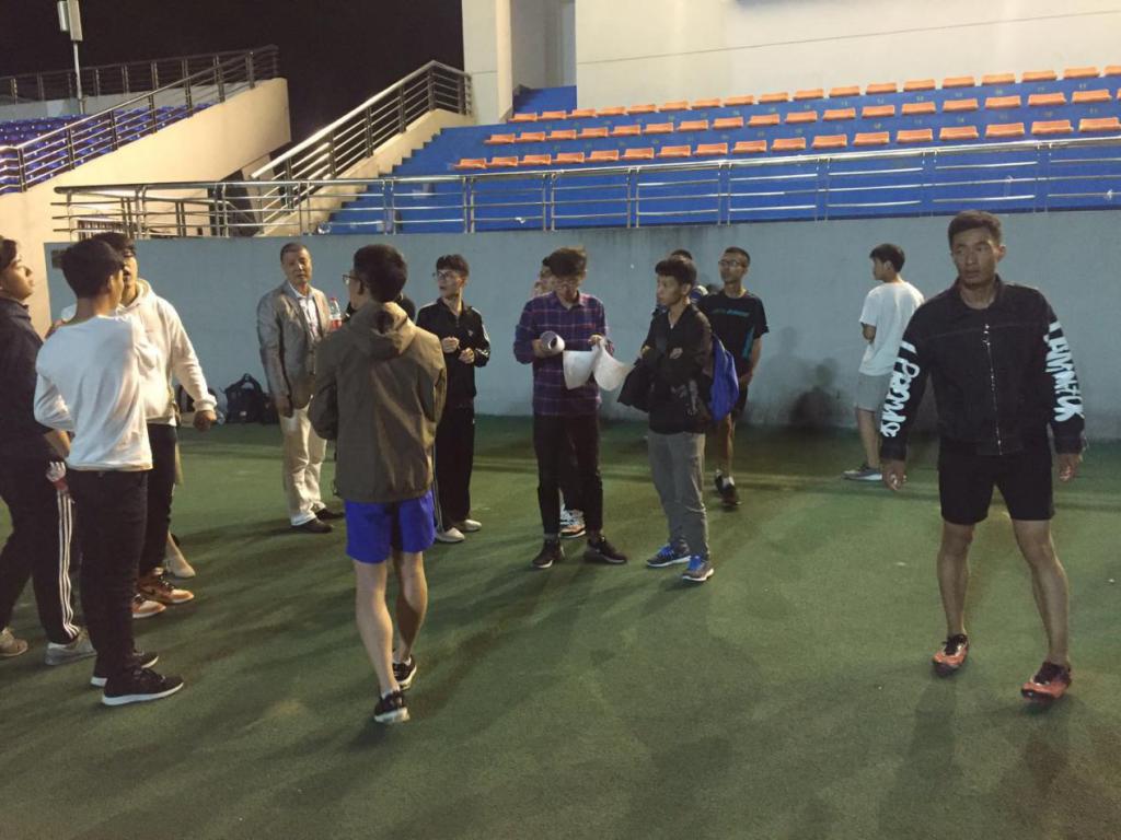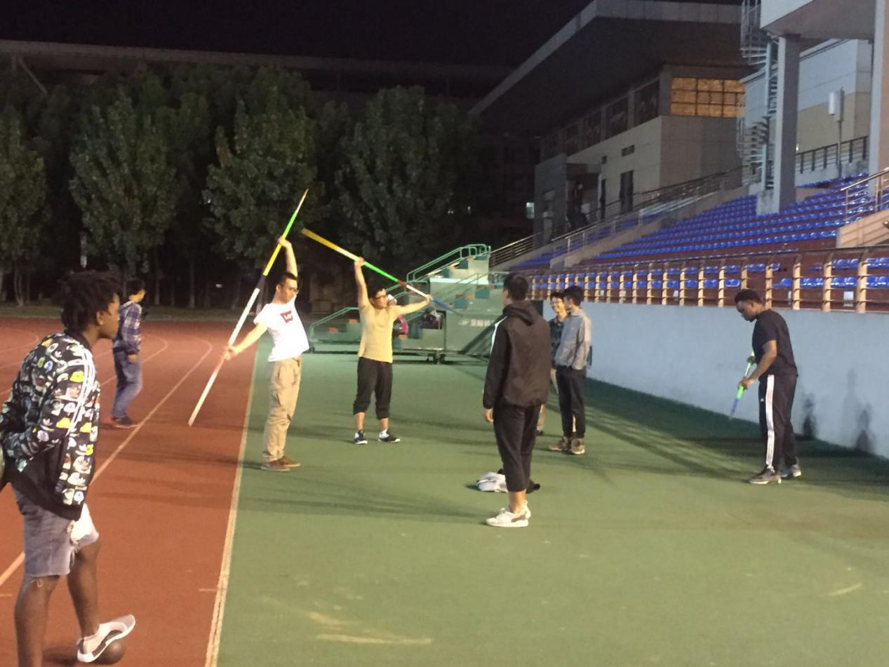 在体育学院教练的指导下,同学们积极投身于标枪训练前的热身活动中。