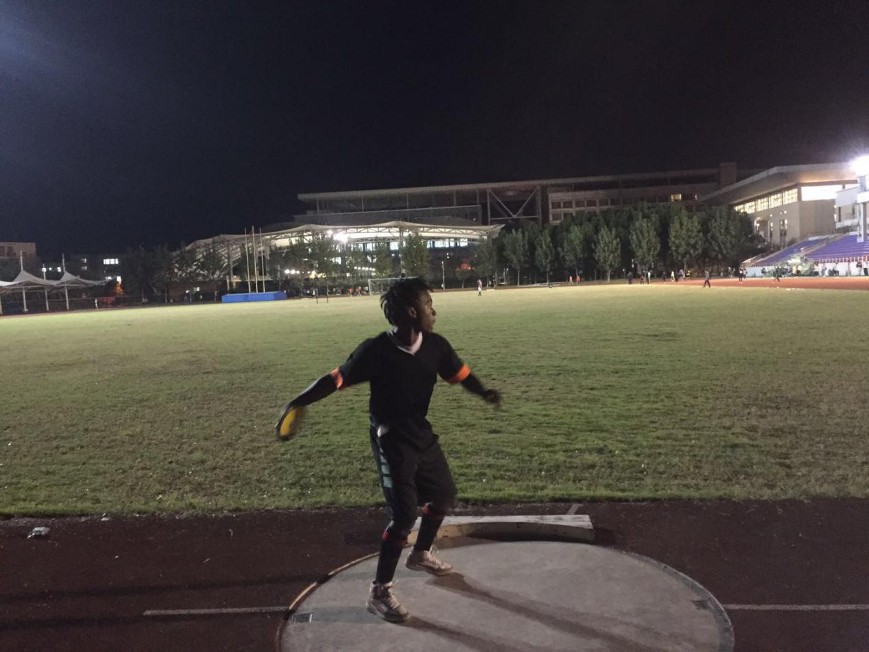 留学生victor在训练扔铁饼中。