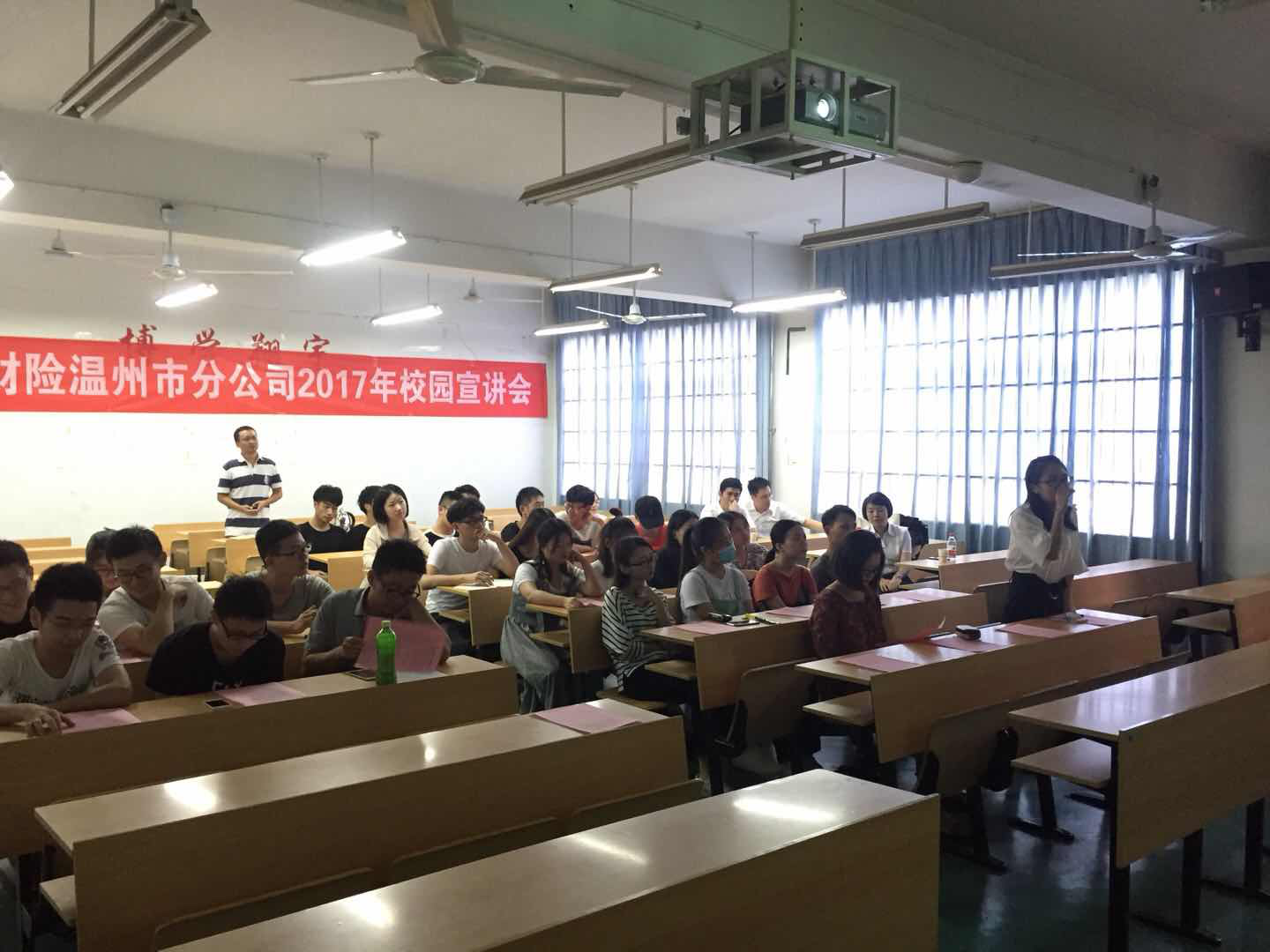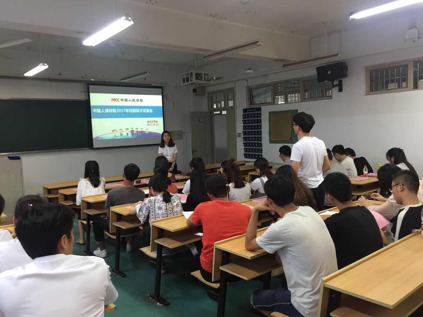 在经过一番沟通交流之后,来自中国人保财险温州市分公司人力资源部的高玉琼女士,真正开始了以“正青春·一起拼”为主题的介绍。先后介绍了当前保险行业市场,以及其所在的世界500强企业中国人保财险公司。从公司体制、优势、文化等到员工培养路线,员工薪酬待遇、员工升职空间等,详细进行了介绍。
