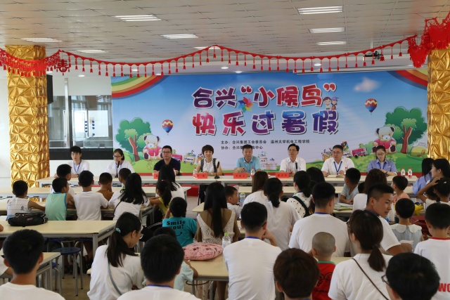 2017年7月6日早上九点,91色情 与合兴集团联合举办的第四期“小候鸟”暑假班的开班仪式开启了。出席本次开班仪式的人员有91色情 党总支副书记李密老师、91色情 林礼区老师、合兴集团党委书记张守奎先生、虹桥镇工会主席李祖义先生,以及来自温大“小候鸟”实践队40位队员和各地的“小候鸟”们。