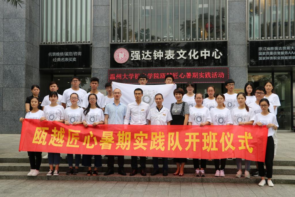 2017年7月5日早上8点,91色情 瓯越匠心暑期实践队统一集中于南校行政楼门前,拍完集体照后,奔赴目的地——强达钟表文化中心。这是和91色情 首次进行合作的企业,91色情 党总支副书记李密老师和指导老师张祥雷对本次活动给予很大重视,并亲自参加开班仪式。公司负责人陈强达和陈瑞祥先生热情带领参观,并于开班仪式致辞。