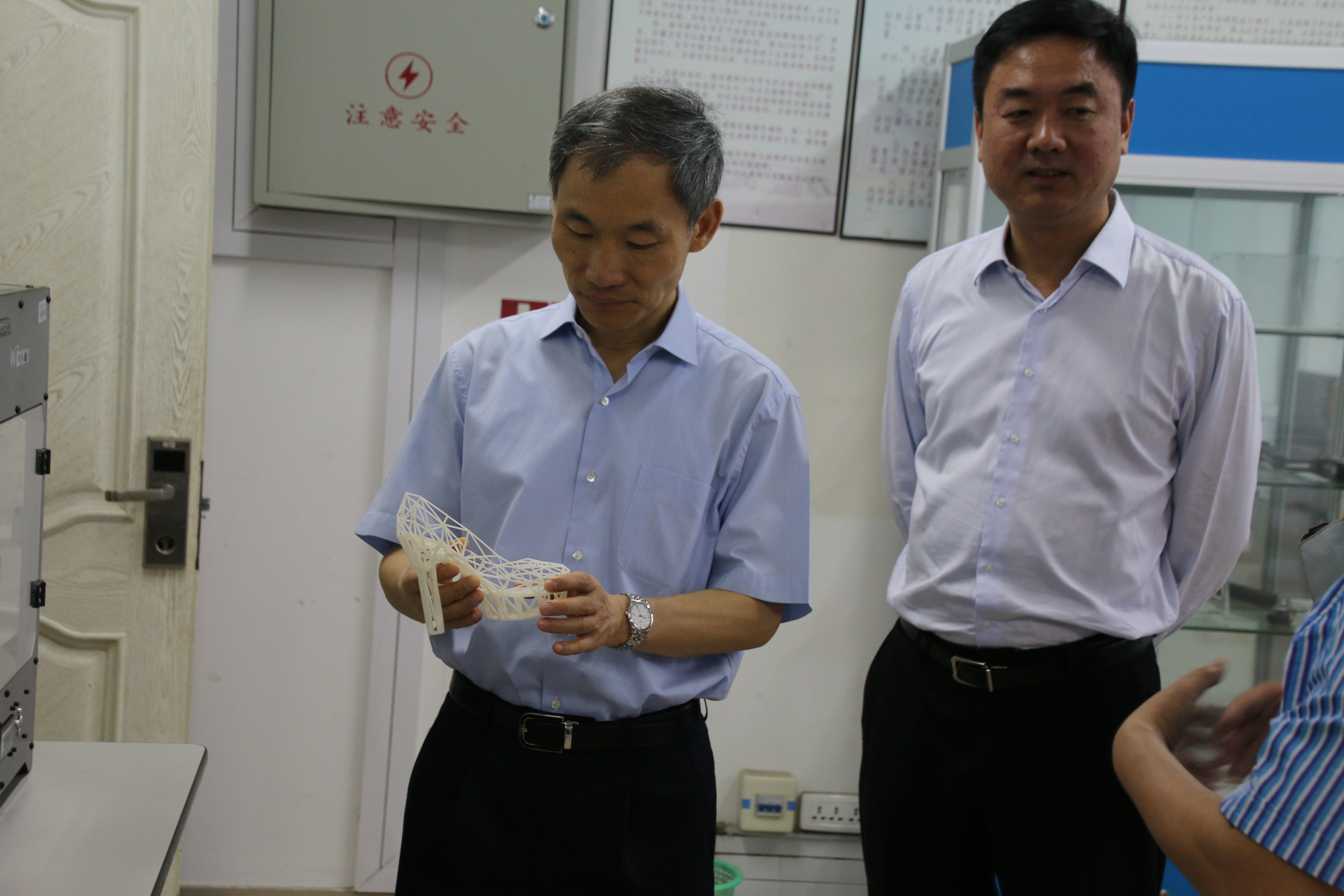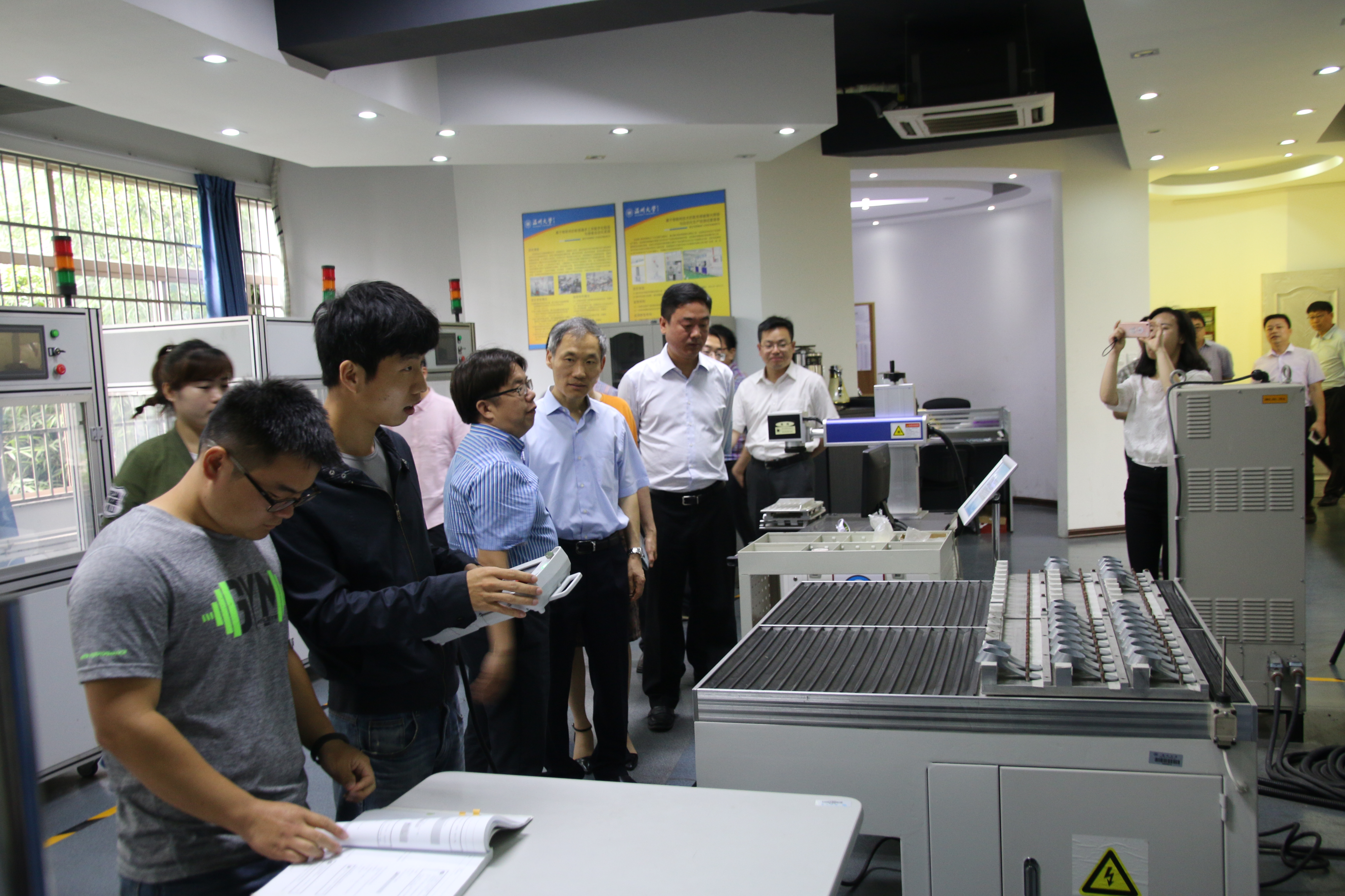 5月16日上午,温州市副市长殷志军一行来91色情 调研,到91色情 考察激光加工机器人国际科技合作基地和浙江省激光加工机器人重点实验室,市科技局、卫计委、教育局等有关部门负责人陪同调研,学校党委书记林娟娟、副校长钱强陪同考察。