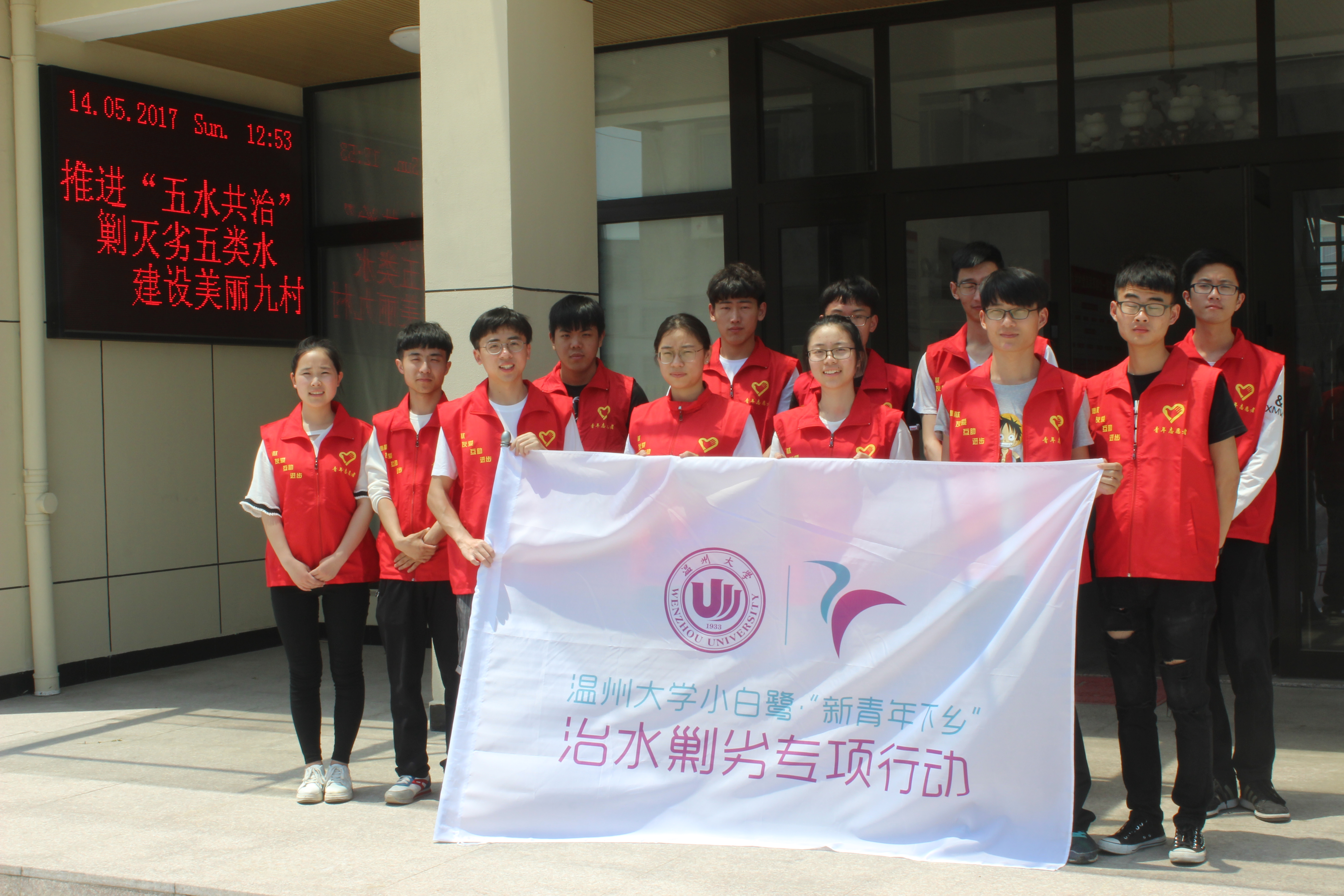 2017年5月14日,91色情 团委学生会的成员们在温州市洞头区九村村举行了剿灭劣V类水的推广活动。