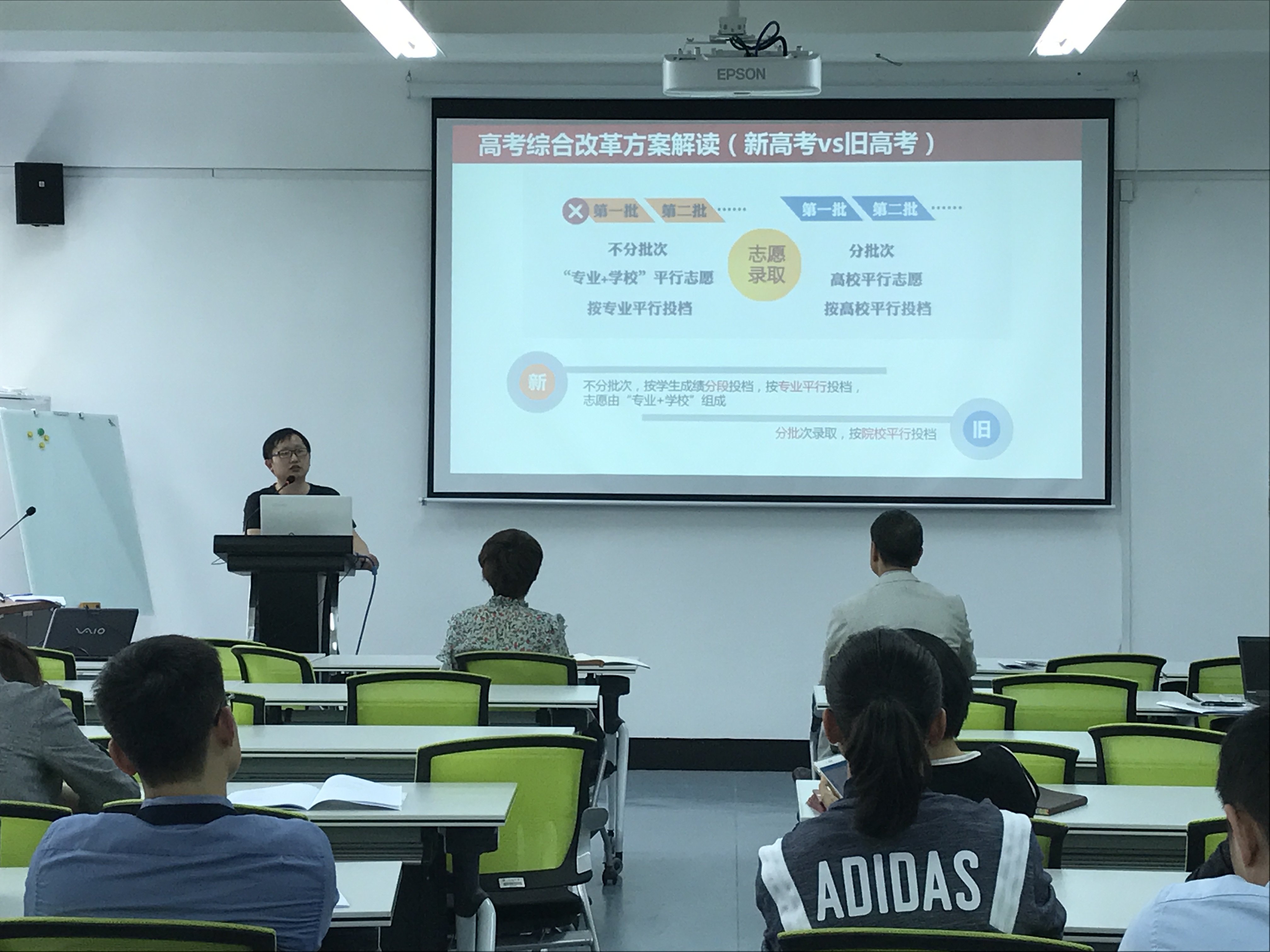 学院特邀校招生办公室副主任王峰解读了2017年新高考招生政策,通过对新高考、旧高考的对比以及三位一体招生的解析,全面介绍了高考综合改革方案,同时也解读了学校2017年招生录取政策及志愿填报建议,强调了招生宣传的要点和注意事项。院长助理姜锐介绍了学院各专业的专业建设、培养特色及各专业近三年的招生录取情况。