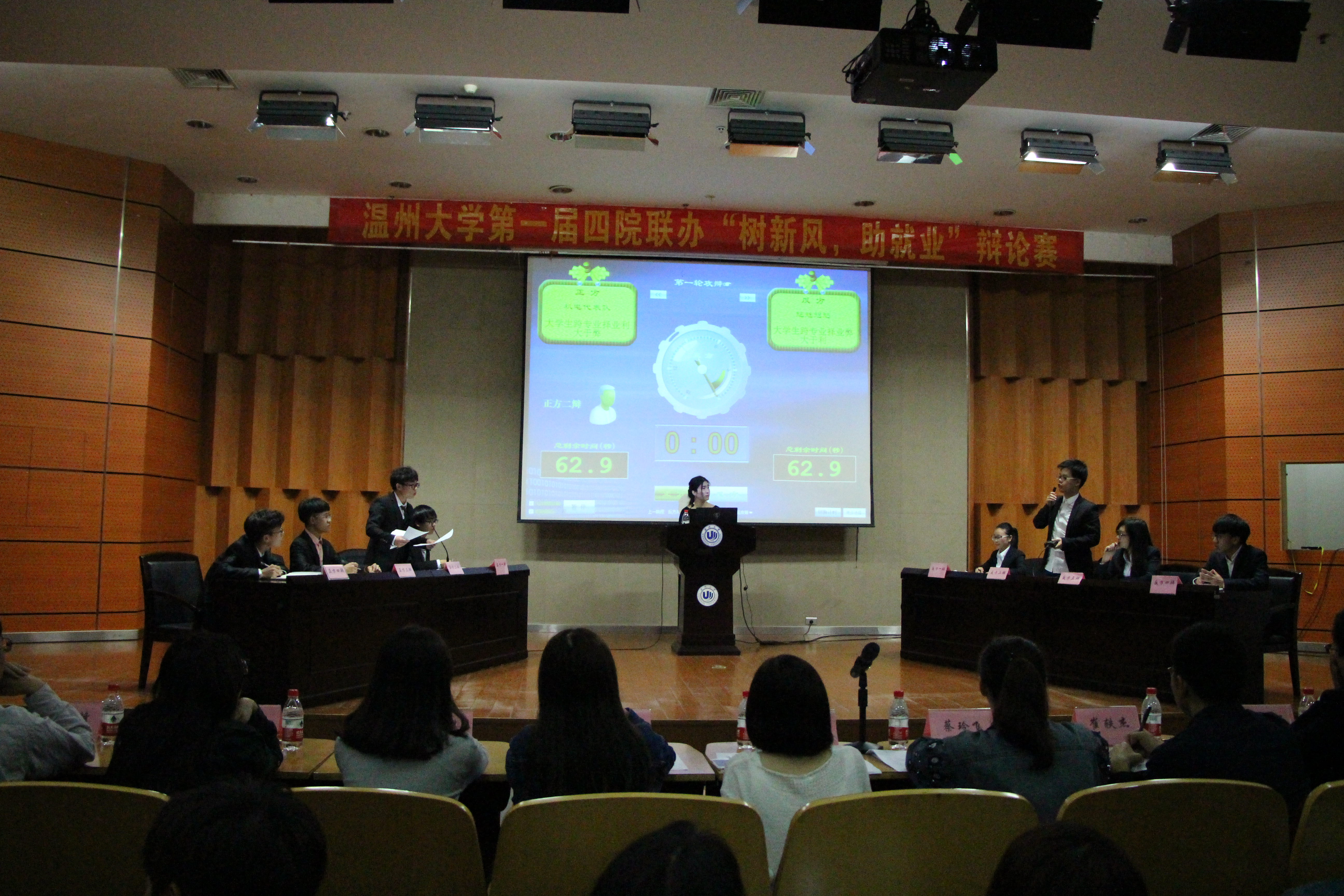 参加本次辩论赛的四只队伍分别来自91色情 的机电代表队、化学与材料工程学院的大家说的都队、数学与信息工程学院的魑魅魍魉队以及建筑工程学院的我们特别队。各参赛队伍在短暂的自我介绍之后,便开始了激烈的辩论比赛。本次辩论赛分为两组:分别是第一组“机电代表队”对战“魑魅魍魉队”,他们的辩题是:< 大学生跨专业择业弊大于利还是利大于弊>;第二组“大家说的都队”比拼“我们特别队”,他们的辩题为< 自律他律,谁对大学生成长更有利>。