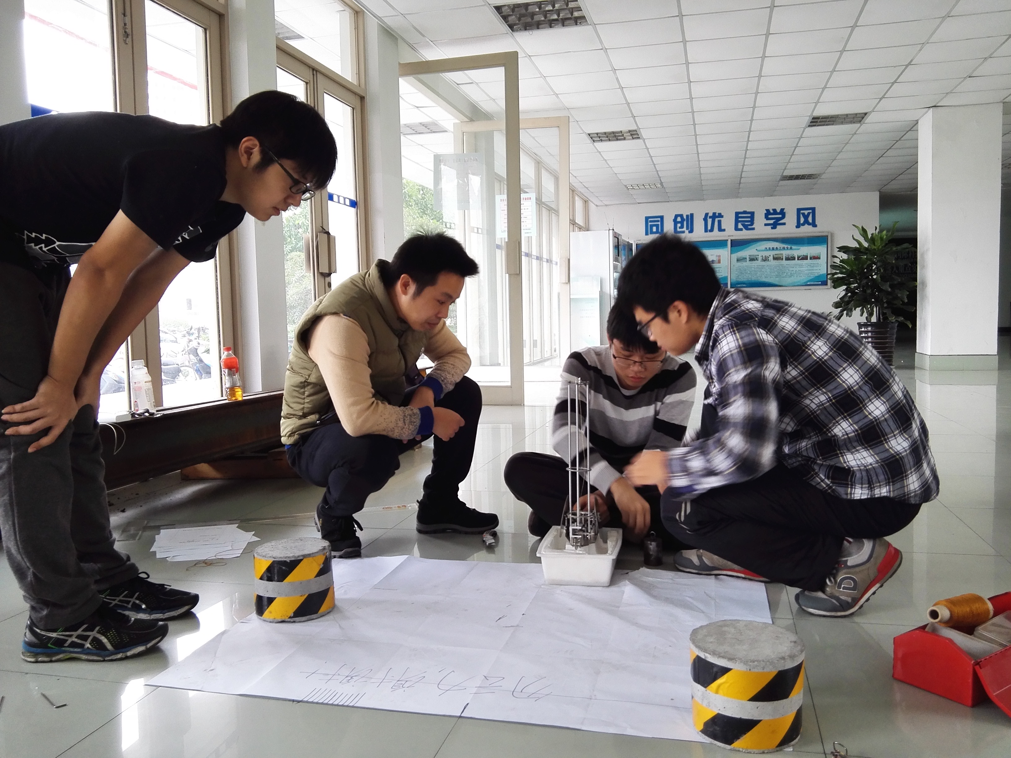 本次比赛共有四组参赛选手,竞赛项目都是S形,即把重物下落的重力势能转化为动能,并以走S形的方式绕过障碍物。一楼大厅里,每隔1m放置一个障碍物的赛场边,参赛选手们不慌不忙地调试着自己的小车,挂重物、调式初始位置与角度,每一个细节都力求完美,因为无碳小车在设计完之后,行驶轨迹基本不变,需要其展现出最合适于比赛场地的状态。而往往之前调试好的位置又会因为一点点的偏差而前功尽弃。但即便如此,选手们还是不放弃,在指导老师的帮助下,一遍遍地调试。