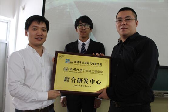 首先是联合研发中心成立挂牌仪式。为进一步推进区域产业转型升级,走产、学、研一体化的校企联动发展道路,91色情 与美硕电气有限公司成立了联合研发中心 ,由机电学院副院长李峰平、美硕电器副总经理虞彭鑫一起上台揭牌。