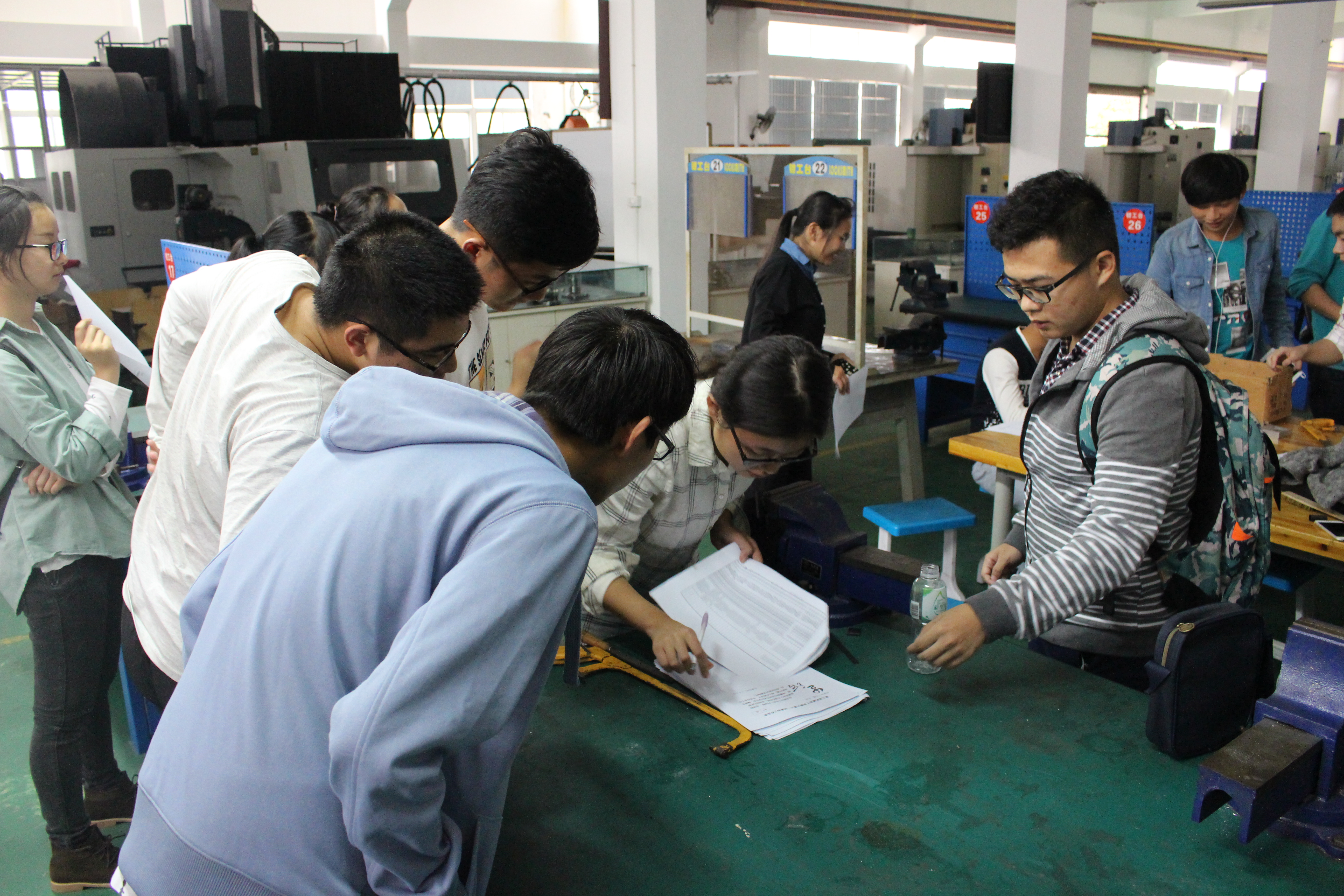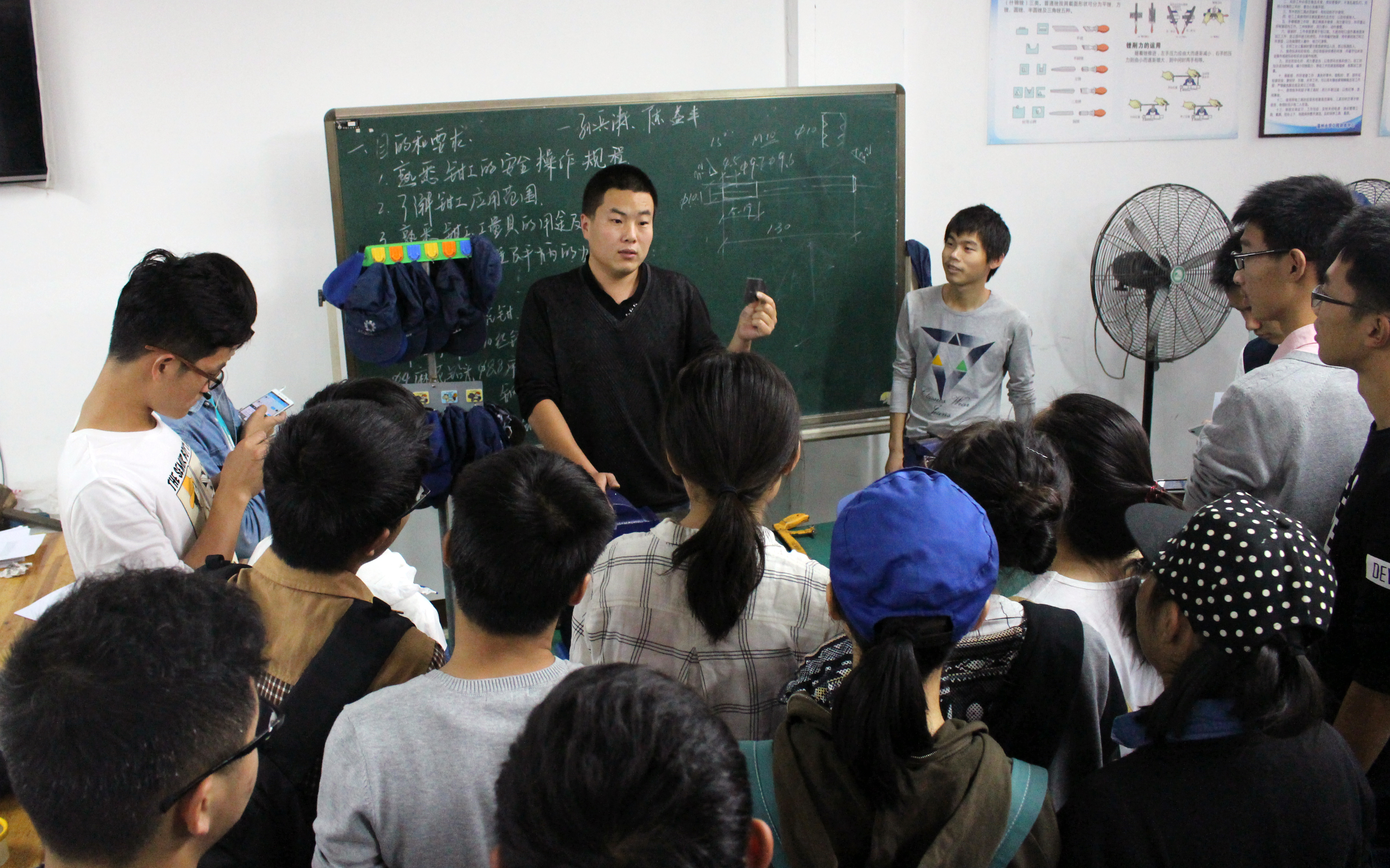 上午8:30,比赛正式开始,老师把同学们聚集起来交待操作时的注意事项,比如什么样的钻床不能钻什么样的孔,大一新生们还不太了解器械的规格,于是老师尽量用通俗易懂的语言使同学们理解,以保证同学们操作时的安全。拿到自己的铁片后,同学们都展现了极大的想象力,有把铁片磨成小汽车的,疾驰在操作台上,有把铁片加工成电磁炉的,在车间就烹饪起了美食佳肴,金属与金属铮铮碰撞,正如同学们的参赛热情。