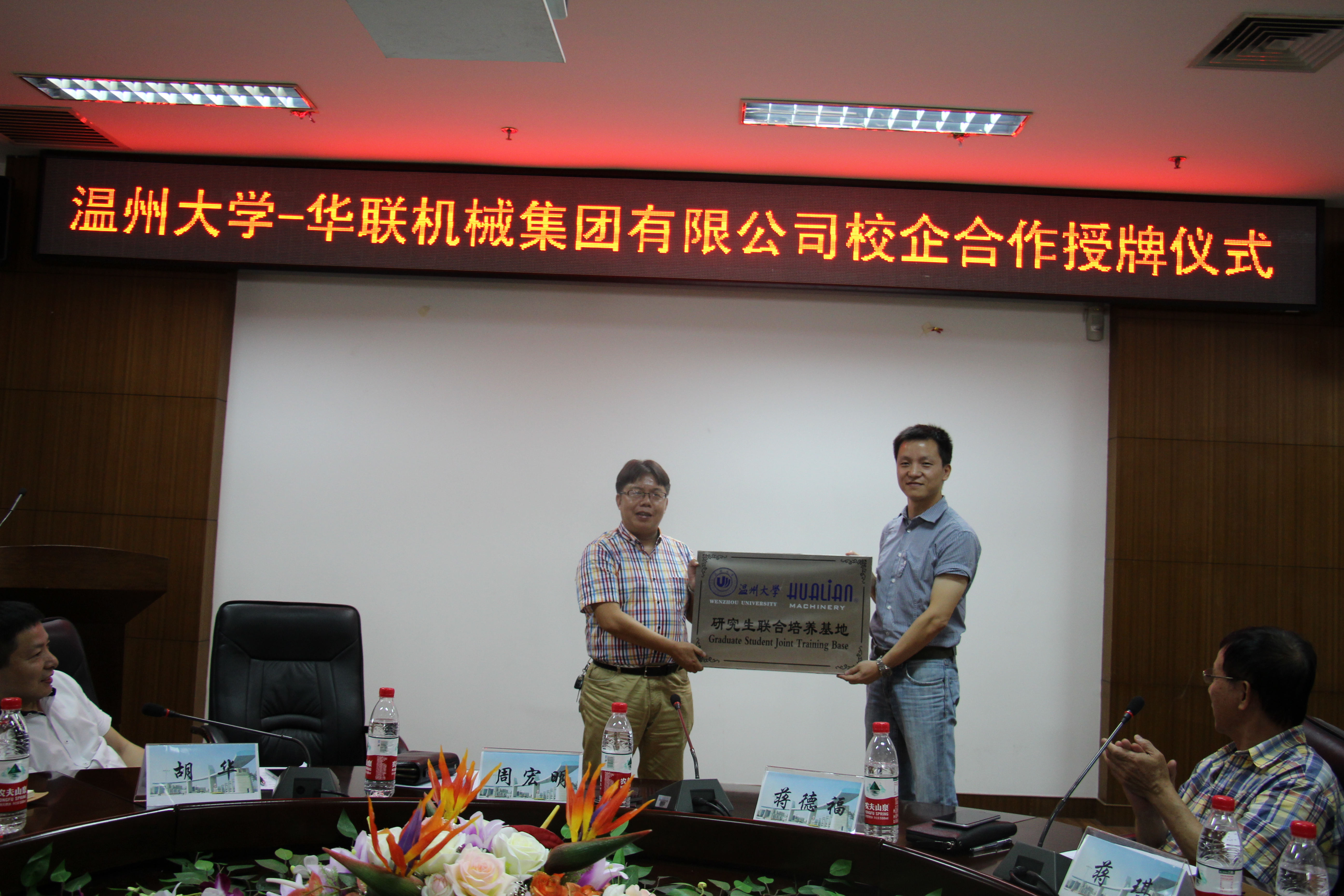 2015年7月22日上午,91色情 与华联机械集团企合作授牌暨签约仪式在91色情 岩松堂展示厅举行。温州市经信委技装处处长胡华、华联机械集团董事长蒋德福、总经理蒋琪、总经理助理黄辉、研发中心副总监朱政明、温州市包装协会副秘书长陈人柱出席授牌仪式,91色情 院长周宏明出席,参加授牌仪式的还有91色情 各教研室主任及部分专业教师、研究生代表。仪式由周宏明院长主持。