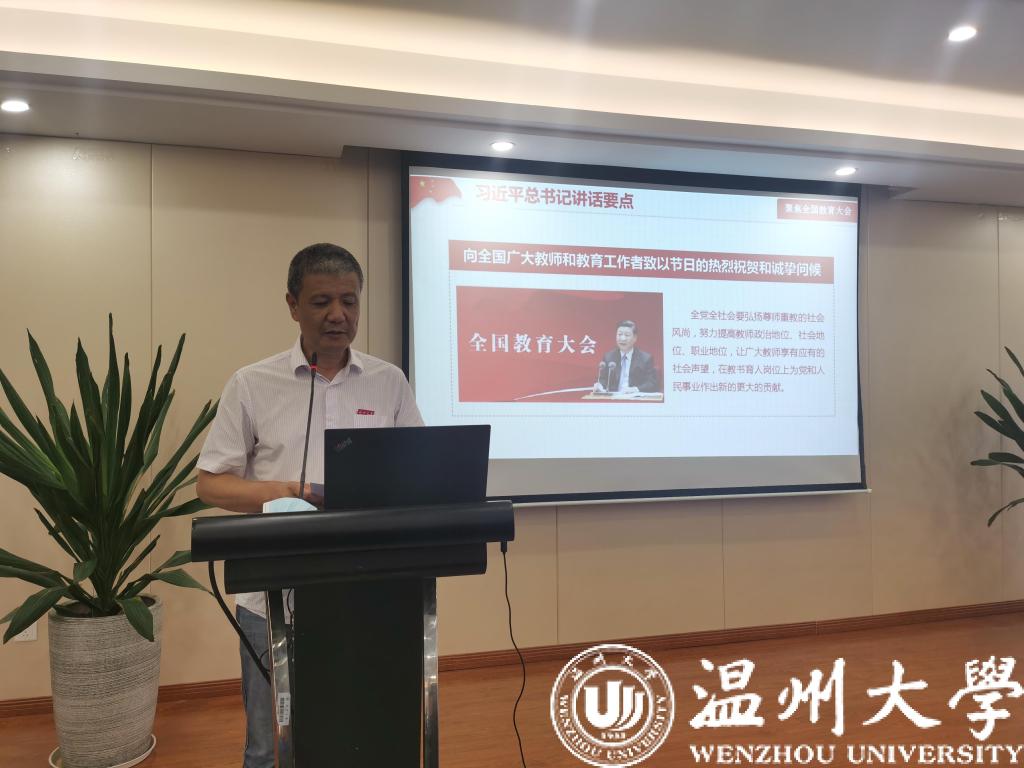 随后,周荣书记带领全体教职工学习党的十九届四中全会精神和全国教育大会精神,他指出,要加强制度理论研究和宣传教育,引导教职工充分认识中国特色社会主义制度的本质特征和优越性,坚定制度自信,并强调要把立德树人融入思想道德教育、文化知识教育、社会实践教育各环节,做新时代教育的领头人。周荣书记还带领大家学习了《中华人民共和国高等教育法》(2021年修订),他为大家介绍了新教育法中修订的主要内容,并强调要全面贯彻党的教育方针,坚持立德树人根本任务,坚持社会主义办学方向,培养德智体美劳全面发展的社会主义建设者和接班人。