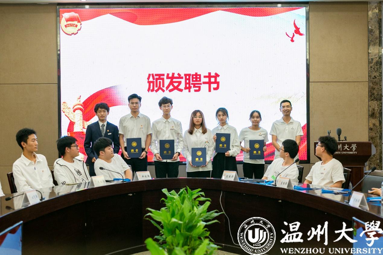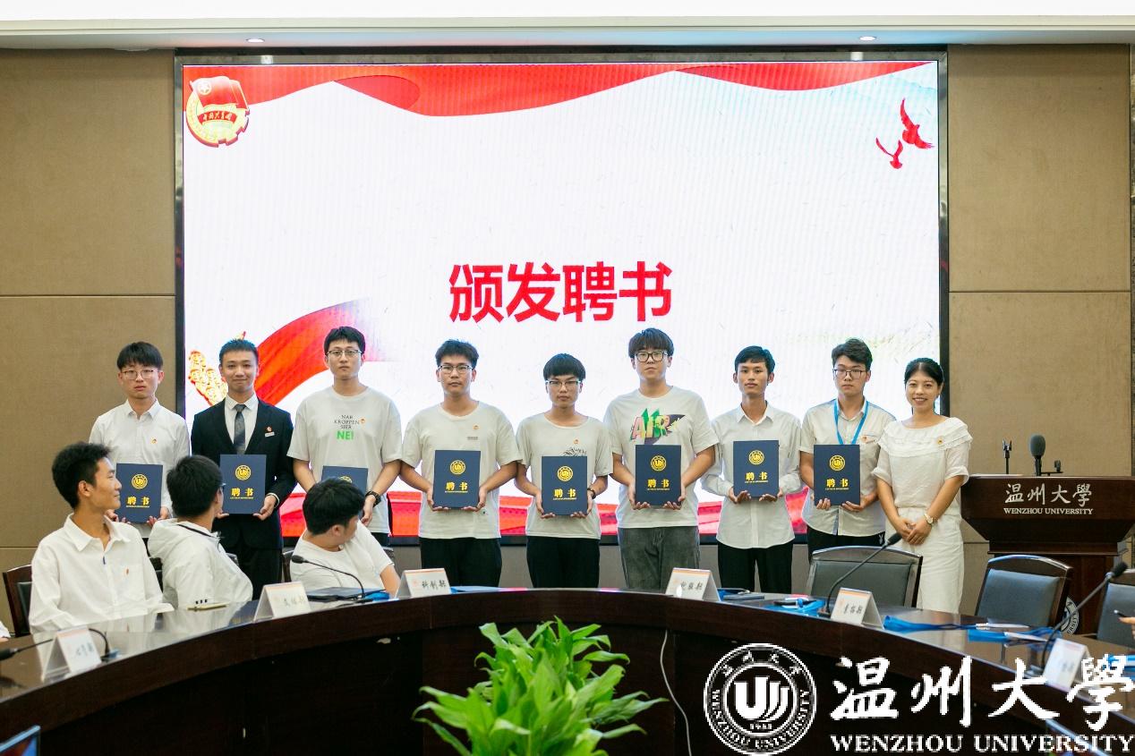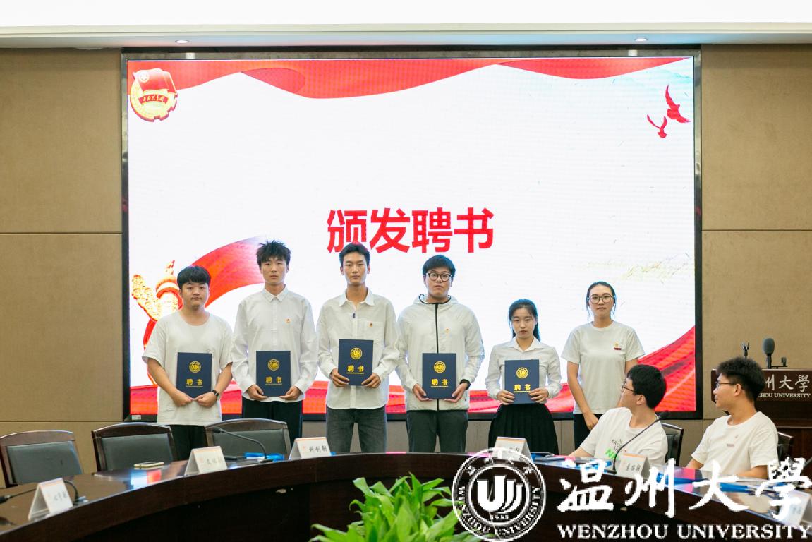 第六项议程,由院党委副书记黄玮老师、团委书记杨奇老师、辅导员史凤娟老师、刘言君老师为新一届主席团成员和各部门部长颁发聘书,祝贺他们选择留任团委·学生会,开启新的人生征程,收获成长的喜悦。
