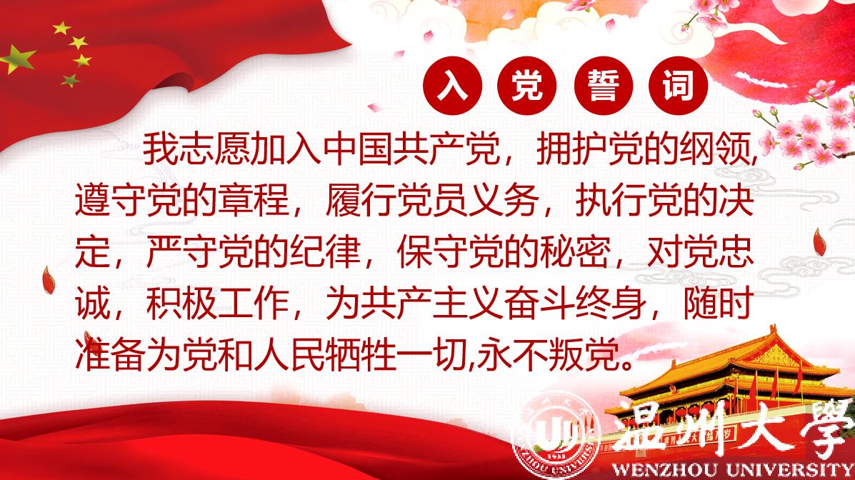 经支部大会讨论决议,一致同意接收余成玘、金鸿斌、徐湘喻、张越洋、周欲欣、梁嘉伟、林家豪、周洋光8位发展对象为中共预备党员。由支部副书记金舒阳同志带领新发展党员进行入党宣誓。