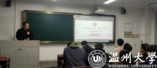 研究生第五党支部书记俞航同志讲述了2022年两会的要点和重点,并就两会在科技创新领域的相关内容做了重点介绍,希望各位党员同志能够在科研学习中勇当先锋,脚踏实地,练就过硬的科研能力和专业技术,毕业后为服务社会贡献自己的力量。