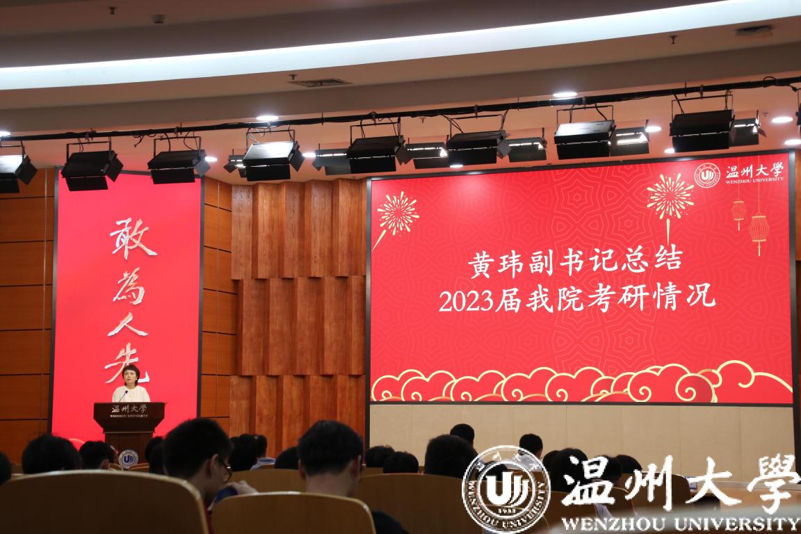 会议伊始,91色情 党委副书记黄玮老师对2023年学院的考研情况进行总结。91色情 考研升学率连续两年突破40%,离不开升学办公室教师团队、学工办辅导员团队、班主任们的全心付出,总结了一年来91色情 开展的二十余项考研帮扶活动。肯定了机电学子们近一年备考的努力和付出,学霸宿舍、退伍大学生、考研搭子等榜样的力量,振奋人心,他们的成功经验为学弟学妹们起到了示范性作用。同时,表达了对上岸学子们的殷殷祝福,希望他们能在追梦路上,将“求学问是、敢为人先”的校训融入日常生活中,在担当中历练、在尽责中成长。