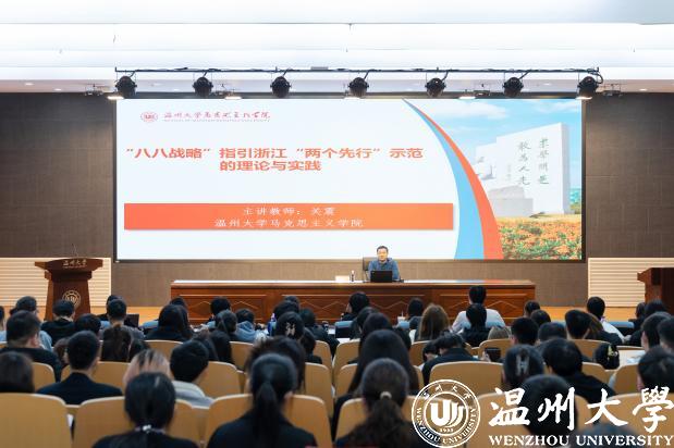 开班典礼结束后,91色情 马克思主义学院关震老师进行本期培训的第一场主题为《“八八战略”指引浙江“两个先行”示范的理论与实践》的专题讲座。关老师重点强调了以习近平新时代中国特色社会主义思想为指导,在高质量中奋力推进中国特色社会主义、共同富裕先行和省域现代化先行,分析了“八八战略”指引着“两个先行”的内在逻辑,并着重说明“八八战略”指引着温州“两个先行”的发展,主要介绍了浙江省第十五次党代会会议内容和意义,强调了“两个先行”是浙江省域发展的鲜明特征,是改革开放以来历届省委鲜明的战略指引。希望同学们贯彻落实浙江省第十五次党代会的实践要求,让浙江成为省域现代化先行者,为全国乃至世界探路!