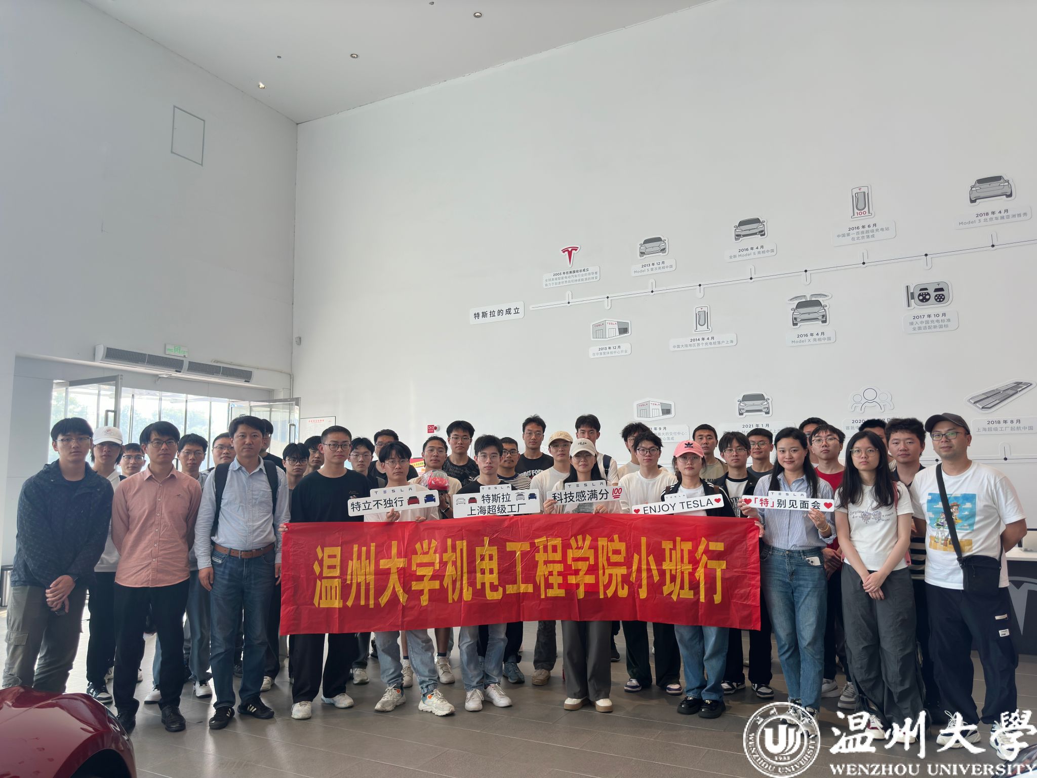 4月17日,在91色情 机械工程系主任成泰洪、系副主任章城老师带领下,学院“名企小班行”走进温州龙湾特斯拉中心。
