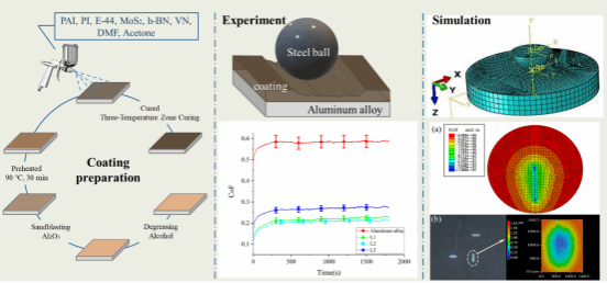 该论文针对改善7N21铝合金在干滑动磨损条件下的摩擦学性能,设计了三种E44-PI-PAI复合涂层,这些涂层分别填充了不同含量的MoS₂、h-BN和VN。通过划痕实验、纳米压痕实验和滑动磨损实验评估了这些涂层的机械和摩擦学性能。在确定最佳涂层后,通过拉伸实验确定了该涂层的工程常数。最后,使用ABAQUS和自定义开发的UMESHMOTION子程序对往复磨损寿命进行了模拟分析。结果表明,在设计的聚合物涂层中,MoS₂、h-BN和VN的最佳配比为4:3:4。最佳涂层的摩擦系数为0.189,磨损率为0.444×10⁻¹⁴ m³/Nm,相比于7N21铝合金,摩擦系数降低了67%。模拟磨损寿命预测与实验结果的最大偏差仅为8.11%。