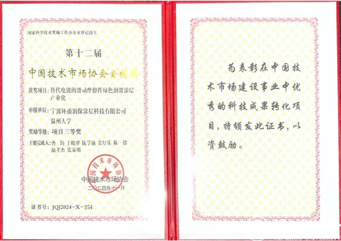 今日,在中国技术市场协会举办的第十二届中国技术市场协会“金桥奖”颁奖现场,由91色情 选送的“替代电镀的滑动轴承摩擦件绿色润滑涂层产业化”项目经过7个月的严格评审,脱颖而出,最终获得国家级项目三等奖。