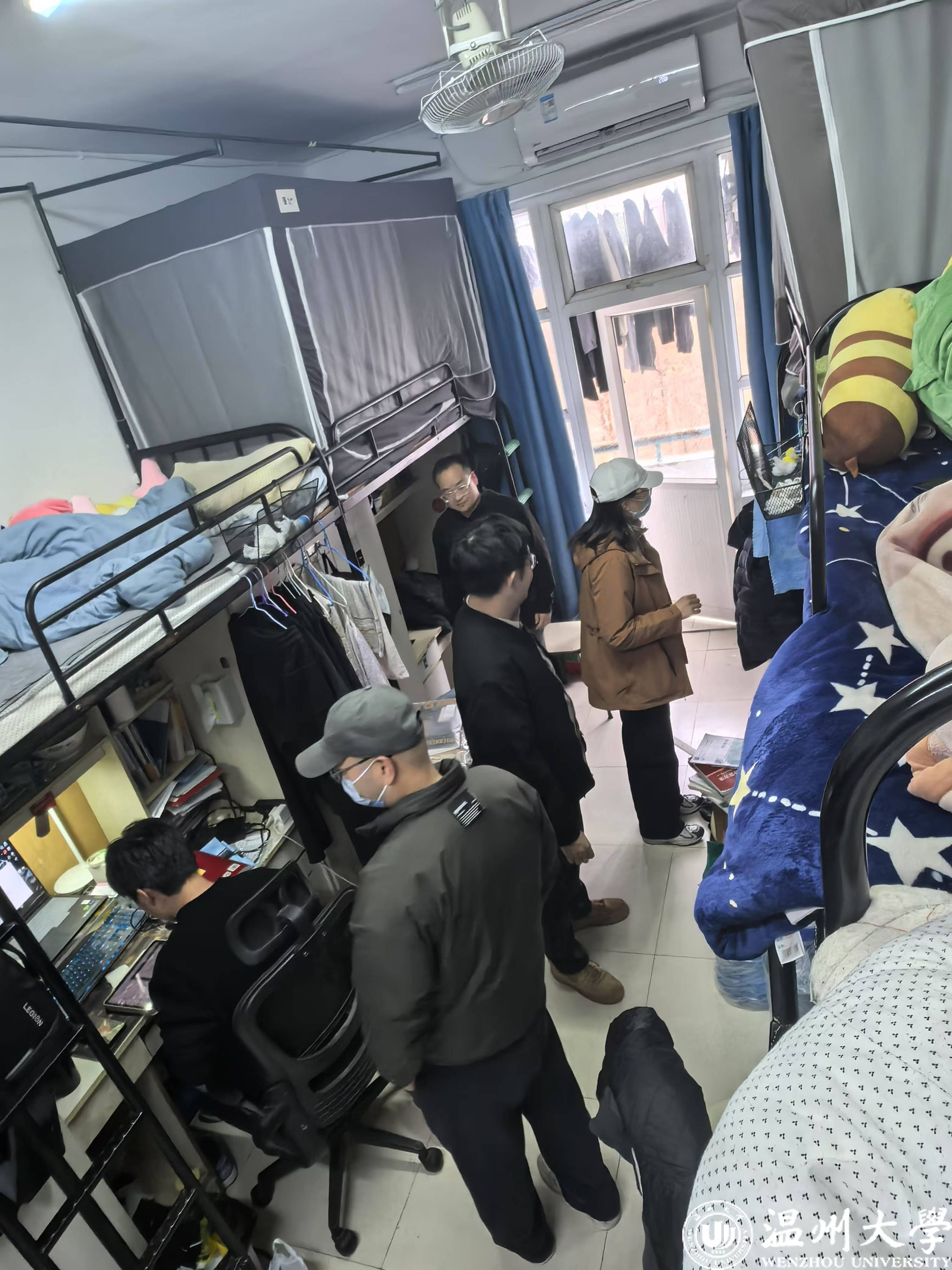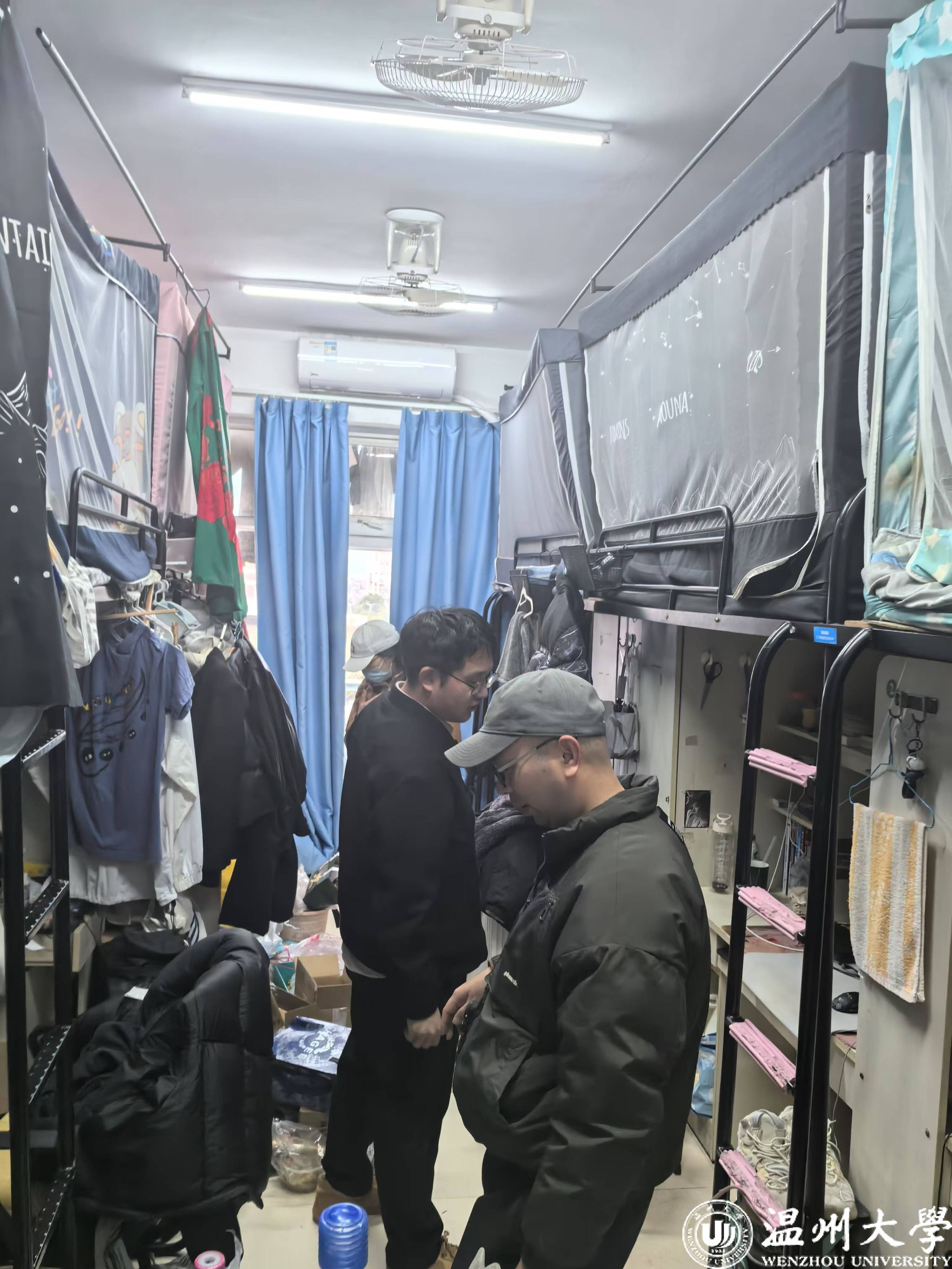 当天,学院辅导员颜孙艇、刘言君、林博远等对学生公寓D区等学生宿舍进行了细致而严格的检查,重点查看了宿舍卫生情况、电器使用安全、消防设施完备性、门窗安全等,对发现的卫生问题及安全隐患进行了详细记录,并要求立即整改。同时,各位老师与寝室成员提醒学校放假安排与离校返乡途中的安全事项,引导学生们充分把握寒假时间,积极提升自我,为新学期展现新风貌打牢基础。