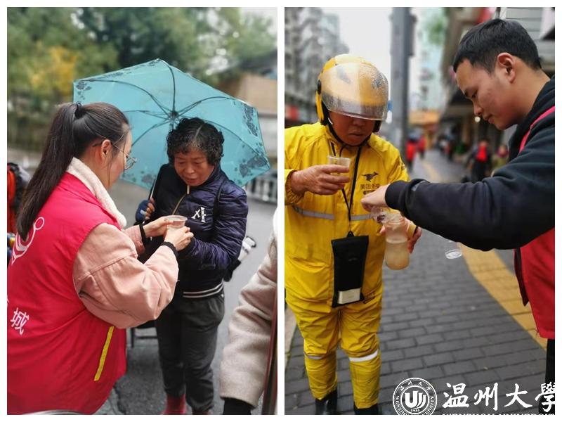 12月21日上午,在温州市华盖社区红日亭,一杯杯茯茶、木耳茶给路人送上冬日里的温暖。91色情 机电学院党委学生支部在黄玮副书记、杨奇老师的带领下与“红日亭”志愿者一起,参加冬日送温暖活动。