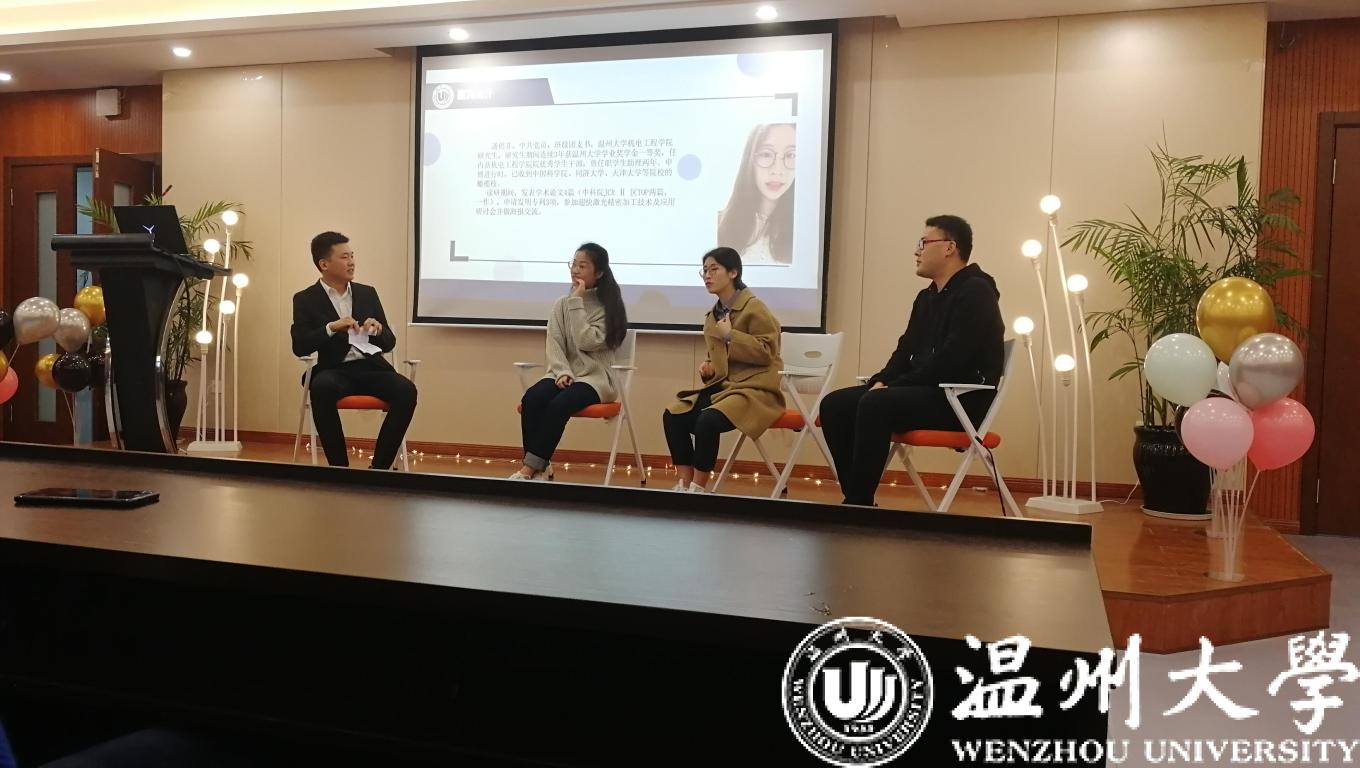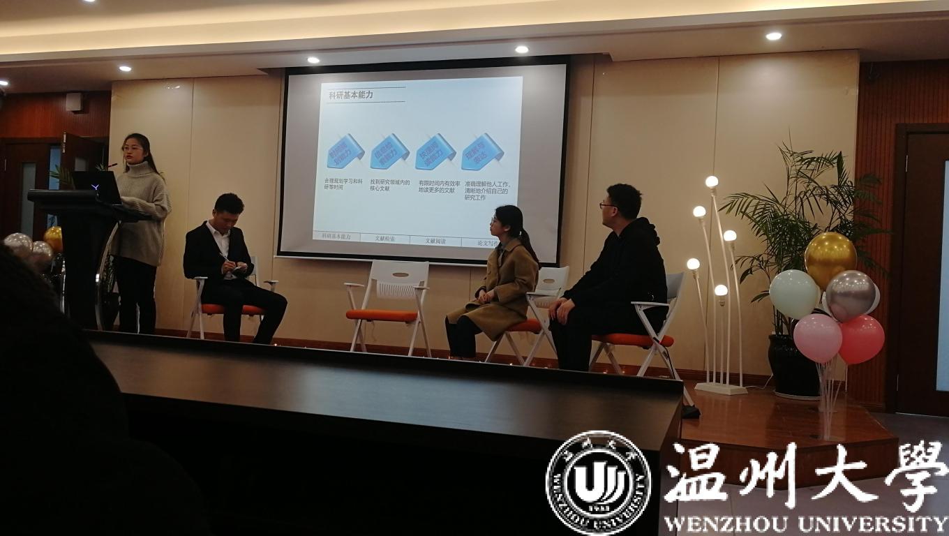12月19日,91色情 成功举办2019年优秀学子学术经验交流会。交流会邀请到浙江省“十佳大学生”、新加坡南洋理工大学在读博士龚玲艳,17级刘琨、潘俏菲、高闯分享了各自的学术经验。学术分享会吸引了91色情 众多研究生和本科生前来驻足聆听。