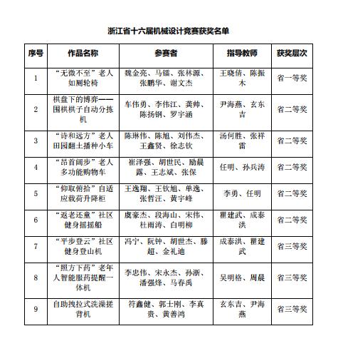 我校91色情 此次共有9支队伍进入决赛。经过浙江省第十六届大学生机械设计竞赛专家委员会的认真评阅和审定,91色情 共获得一等奖1项,二等奖5项,三等奖3项,进入决赛的作品全部获奖的佳绩,获奖作品见下表。
