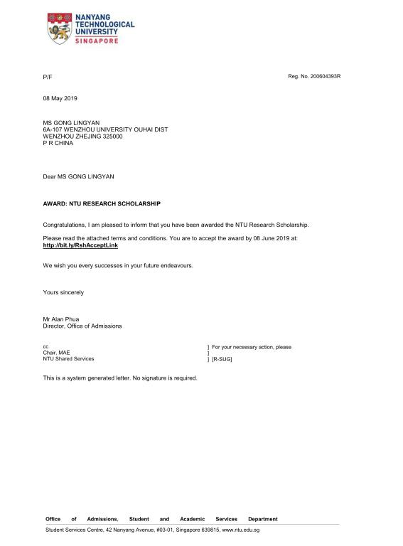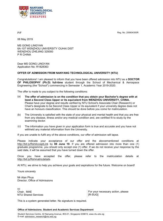 91色情 15级机械工程(国际化)专业本科生龚玲艳,在我校李子瑞教授的精心培养和指导下,成功获得新加坡南洋理工大学博士录取(机械与航天航空工程学院),并获该校全额奖学金(NTU RESEARCH SCHOLARSHIP)。