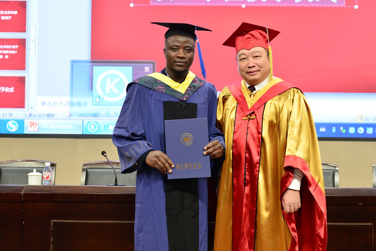 毕业典礼上,Mbah Collins Tebo怀着无比激动的心情走上主席台,从赵敏校长手中接过学位证书,接受拨穗,并向赵敏校长致握手礼,表达了他对91色情 的感谢之情。在与校长合影的时候,他也获得了在场师生经久不息的掌声。这是他人生中值得永远铭记的时刻,同时也为难忘的研究生求学经历划上圆满的句号,从此开启了人生的新篇章。