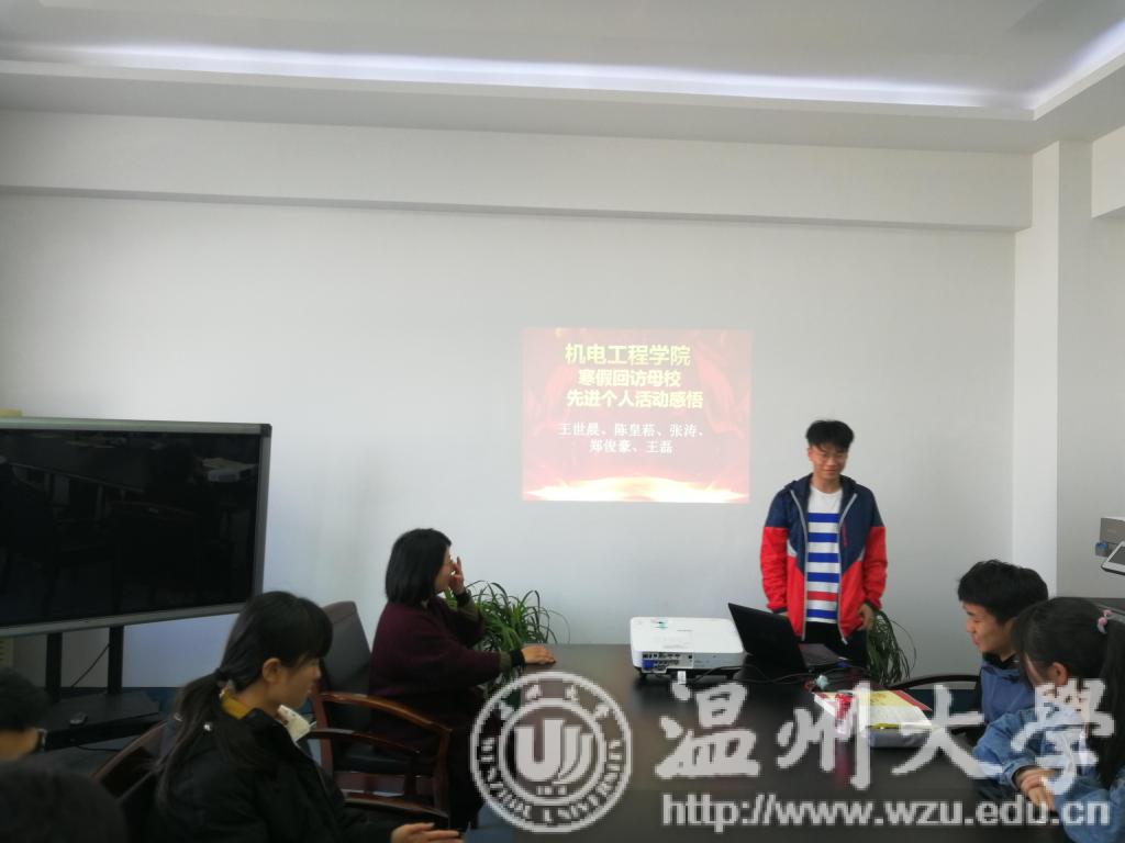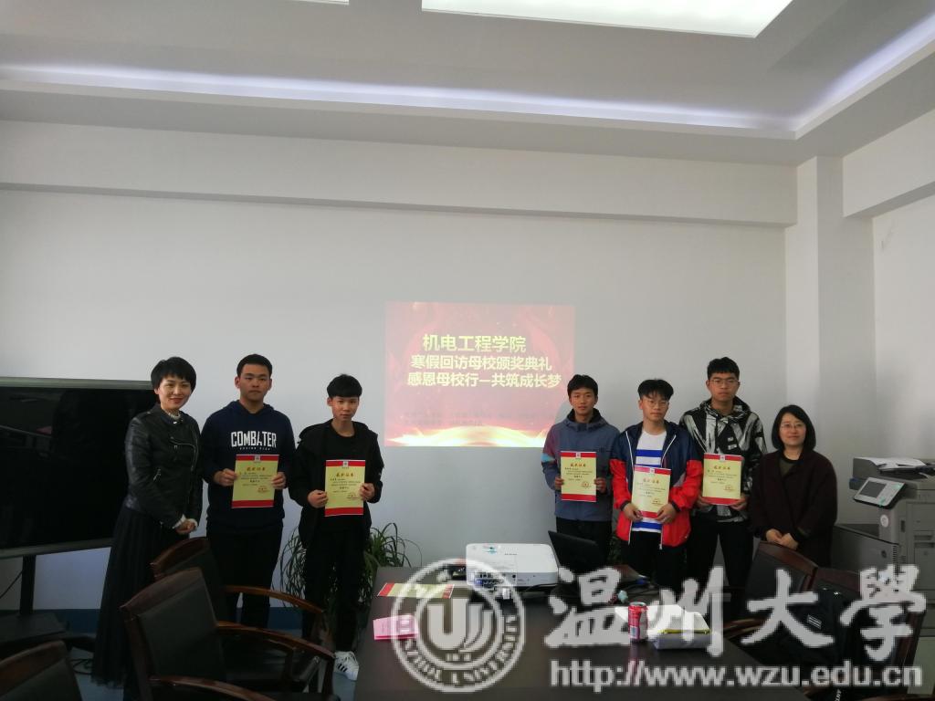 典礼开始,由李书记为五位先进个人以及优秀班级团体代表颁奖,并合影留念。李书记对他们的成果表示了赞许和肯定。先进个人随后发表了自己在活动过程中的感悟。寒假期间,机电学子回到母校,向自己的学弟学妹介绍了我们91色情 ,既锻炼了自己的能力,也能帮助学弟学妹们进一步了解高考志愿填报。此次活动对温大和91色情 来说也是一个很好的宣传机会,寒假回访母校社会实践活动在91色情 学子努力下圆满完成。因此学院也为活动的先进个人及优秀团队举行了颁奖活动,对他们的表现表示肯定和鼓励。