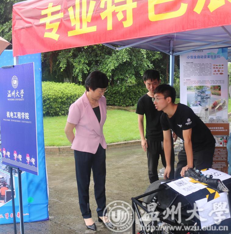 在报到处的另一侧,91色情 优秀学子的科技作品也吸引了许多新生及家长驻足欣赏,从他们眼中可以看出他们对那些制作出作品的优秀学子们的那一份敬佩。这其中也有我校党委书记林娟娟的身影,她愉悦地与现场的学子进行交流,脸上写满了对91色情 美好未来的期许。