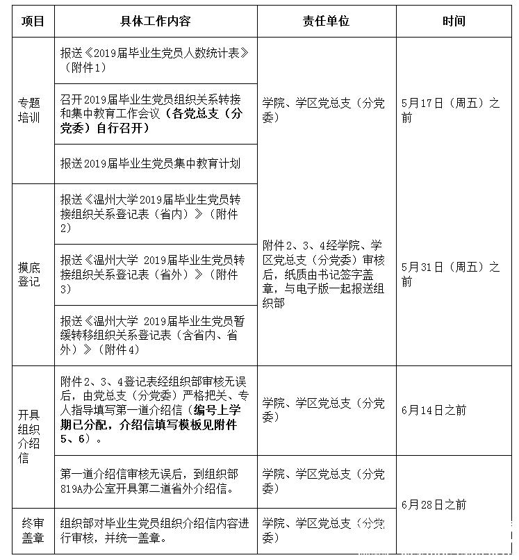 注:组织关系转接到省内基层党组织的,全都在系统内办理转接手续,不再开具纸质介绍信;组织关系转接到省外基层党组织的,仍然需要开具两道纸质介绍信办理转接手续,具体办理方式和时间参照上述表格安排。