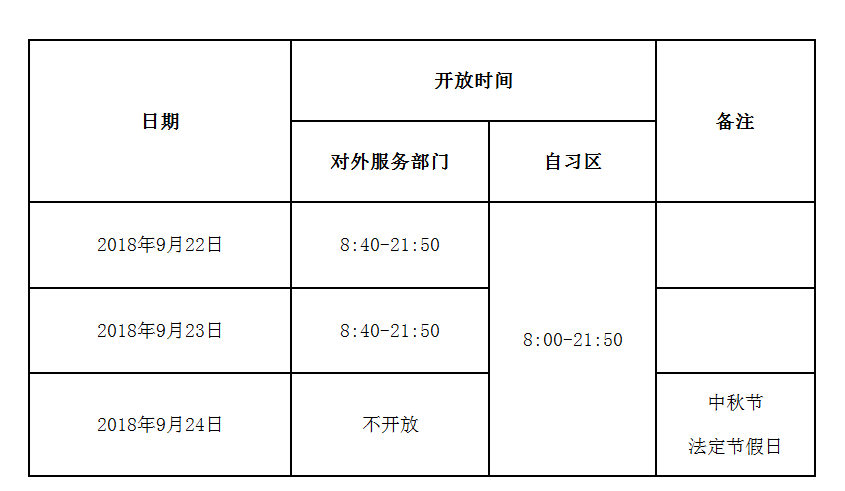 根据本学期校历表安排,图书馆中秋节期间开放安排如下: