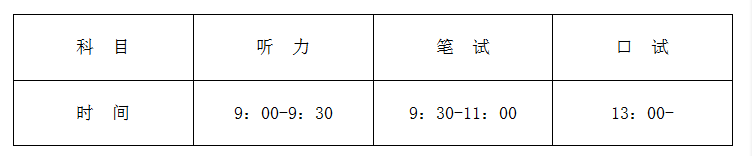 考试语种为英语,包括笔试、听力和口试三个科目。考试对象中的(4)、(6)类人员可只参加听力和口试考试。考试对象中的(5)类人员可只参加口试。