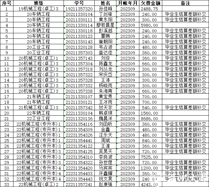 根据学校计财处反馈,截至2024年5月29日,91色情 如下33名同学仍存在学费欠费情况,根据《91色情 学生收费管理办法》温大行政[2014]133号文件规定,第六条,学校对欠费学生进行7天公示,公示期满后如仍然欠费的,本学期做休学处理。第八条,学生在毕业前缴清所有学宿费的,学校提供成绩证明和办理离校手续。请各位同学及时缴纳相关费用,名单如下: