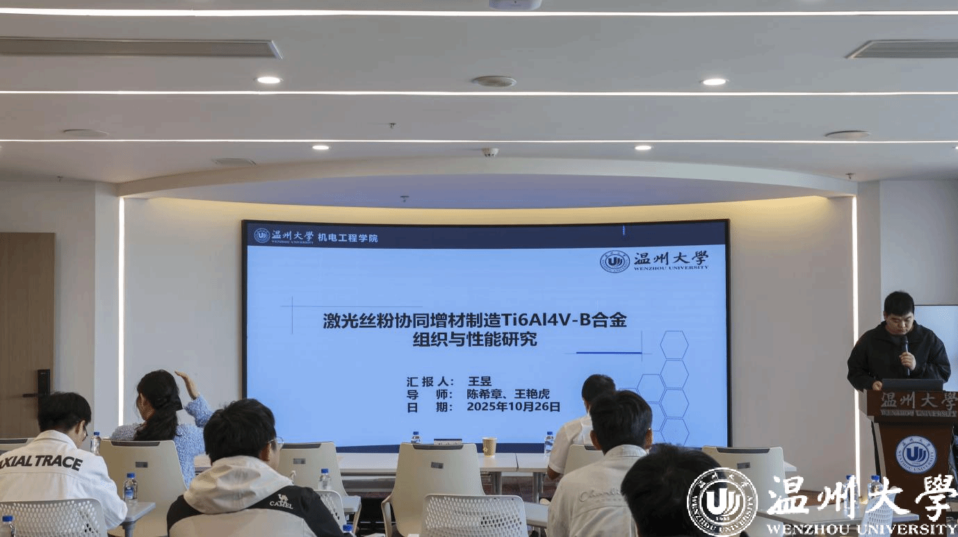 随后,王昱同学以《激光丝粉协同增材制造 Ti6Al4V-B 合金组织与性能研究》为题,详细阐述了激光增材制造技术在钛合金材料中的应用,通过对比不同工艺参数下合金的微观组织与力学性能,为优化该类合金的制备工艺提供了实验依据;