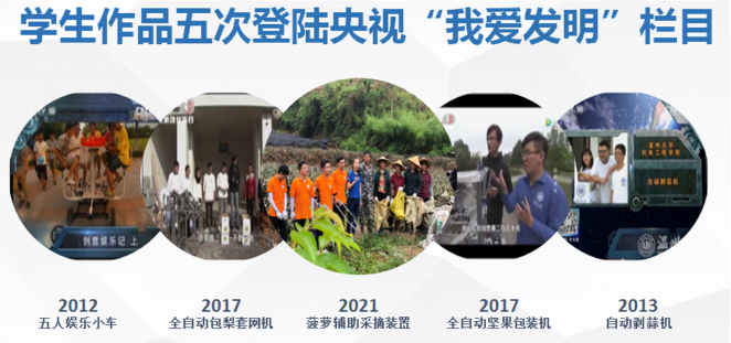 2.建立了“认知—实践—创新”三层次的创新能力培养体系,学科竞赛参与率达89%。本专业学生在全国大学生机械创新设计大赛、电子设计大赛、挑战杯、互联网+等各类学科竞赛中共获得国家级、省级奖项260余项,尤其是:在2016年第七届全国大学生机械创新设计大赛中获全国一等奖5项,在638所高校中排名第一;在2018年第八届全国大学生机械创新设计大赛中获全国一等奖1项(一等奖作品在该组排名第1)、全国二等奖2项;在2020年第八届全国大学生机械创新设计大赛中创佳绩,获全国一等奖3项、全国二等奖2项;在2022年第九届全国大学生机械创新设计大赛中再创佳绩,获全国一等奖2项、全国二等奖3项,成绩在全国高校中名列前茅。学生科技创新作品 “五人娱乐小车”、“全自动包梨套网机”、“菠萝辅助采摘装置”、“全自动坚果包装机”、“自动剥蒜机”,相继被中央电视台《我爱发明》栏目以专题片的形式进行了报道。