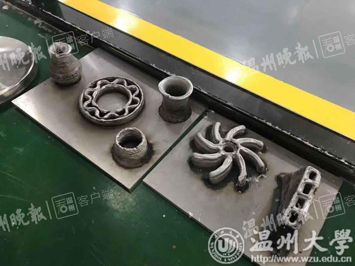 在隔壁的一间操作室里,几位学生正在操作机器人研发平台,通过手上的平板电脑连接机械臂,在台面上熟练地操作控制。“就像3D打印机一样,”操作者介绍道,“只要把预先建好的模型输入电脑,很快就能制作出精确度高的金属元件。”在这间操作室里,摆放着之前通过这种技术制作出来的金属元件,据工作人员介绍,这些原件只需稍加打磨,就能投入使用,大大提高了生产的效率与精确度。