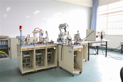 机电一体化室:自动化生产教学系统是学院为提高学生动手能力和实践技能而引进的一套实用性实验设备。该装置由加工站、安装站、安装搬运站(莫托曼机器人)和分类站组成。该系统集成了机电一体化专业所涉及的诸如电机驱动、气动、PLC(可编程控制器)、传感器、机器人等多种技术,给学生提供了综合性的实验平台。这个实验室设备不下于60万元。