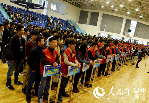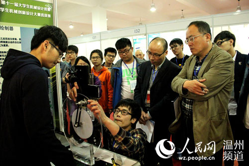 温州4月27日电 全自动升降自擦无尘黑板、机器人助教、多功能激光笔、机器人助教……这是多少学生的梦中课堂。昨天上午,浙江省“合兴杯”第十一届大学生机械设计竞赛在91色情 举行,把梦中课堂变成现实。