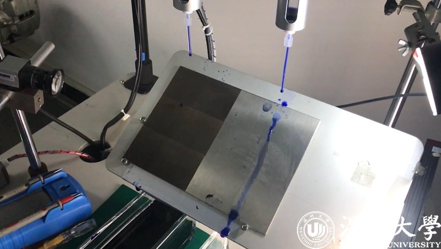 李峰平操作机器,在按下按钮后,两根塑料管几乎同时挤出一颗蓝色水珠,水珠分别掉落在两块金属表面上,呈现出了完全不同的两种形态——一颗水珠一路翻滚掉落,另一颗水珠变成了一摊水迹。