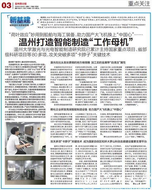 该研究院还依托91色情 机械工程一流学科以及一批国家和省部级科研平台,同时整合北航温州研究院、北京大学-温州激光与光电子联合研发中心、中科院西安光机所等力量,打造形成浙江省温州激光与光电产业创新服务综合体,成为国家自创区和环大罗山科创走廊建设的重要支撑平台。目前该综合体已累计引进30多个激光与光电项目入驻。产业集群已构建起以激光、光电能源、半导体照明、光通信为特色的产业链,集聚了以奔腾、嘉泰、瑞浦新能源等为代表的激光与光电行业关联企业280余家,实现营业收入超685亿元,温州已初步成为浙江乃至长三角激光与光电产业应用的创新创业高地。