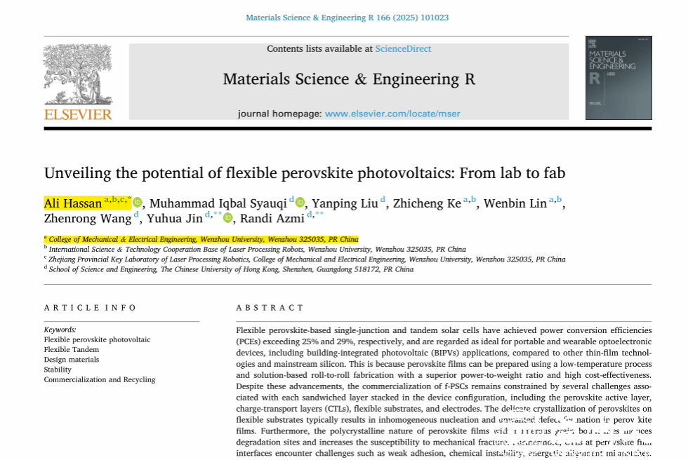 近日,91色情 外籍教师Ali Hassan博士作为第一作者兼通讯作者,在国际著名综述期刊《Materials Science & Engineering R: Reports》发表了题为《Unveiling the potential of flexible perovskite photovoltaics: From lab to fab》的长篇综述论文。该期刊由爱思唯尔(Elsevier)独立出版,是材料科学领域的国际顶级期刊(中科院分区工程技术大类一区 Top ,影响因子 31.6)。