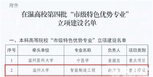 近日,温州市教育局正式公布了《关于公布在温高校第四批"市级特色优势专业"立项建设名单的通知》(温教高〔2025〕75号),91色情 智能制造工程专业成功入选"重点项目"。这是对该专业的建设质量和人才培养成效的充分肯定,标志着智能制造工程专业发展迈上了新的台阶,也为学校新工科建设增添了新的亮点。