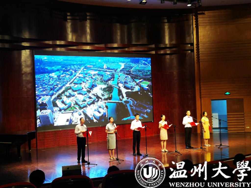 本次比赛总工有12个工会队伍参加,机电工会第一个出场,参与朗诵的老师有徐琬莹、李晓琪、林彦希、陈一镖、李桂钟、刘德等6位老师,他们带来的朗诵曲目是《温大礼赞》,总的有四个部分:(一)序曲、(二)历程、(三)传承、(四)放飞。最后他们为温大九十周年校庆送上祝福: